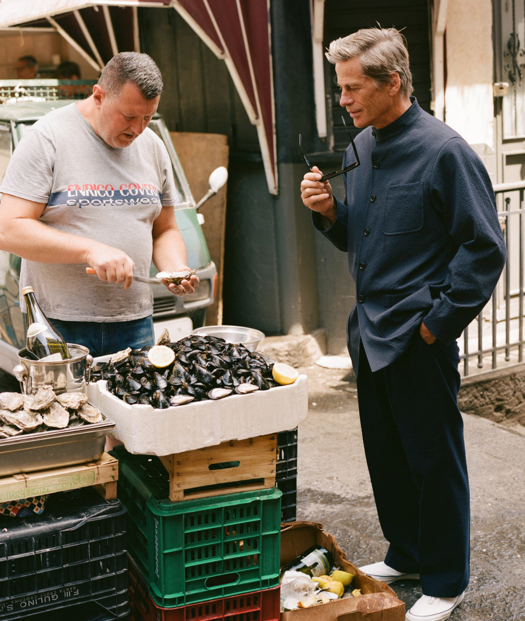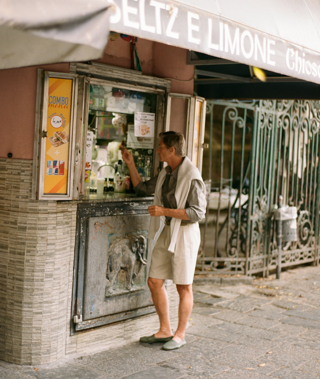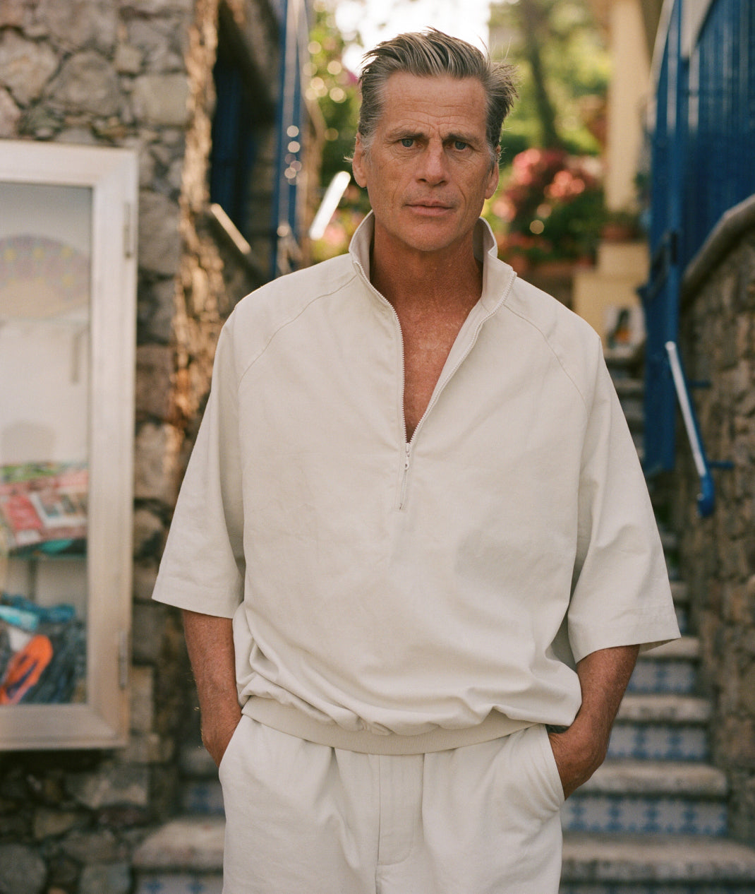 In between cigarettes, beers, espressos, horse, salty lemon drinks, oysters, negronis, sardines, lots of swims and a few vinos our favourite ‘proper man’ Mark van der Loo managed to model some of our spring summer collection. James Harvey-Kelly snapped and clicked away as Mark entertained and Patrick swooned. Day two we trundled around Taormina dodging White-Lotus-dreamers and some seriously impressive tans, some entering the Pantones of ‘coffee’ or ‘basal cell carcinoma’. It was tremendous fun.