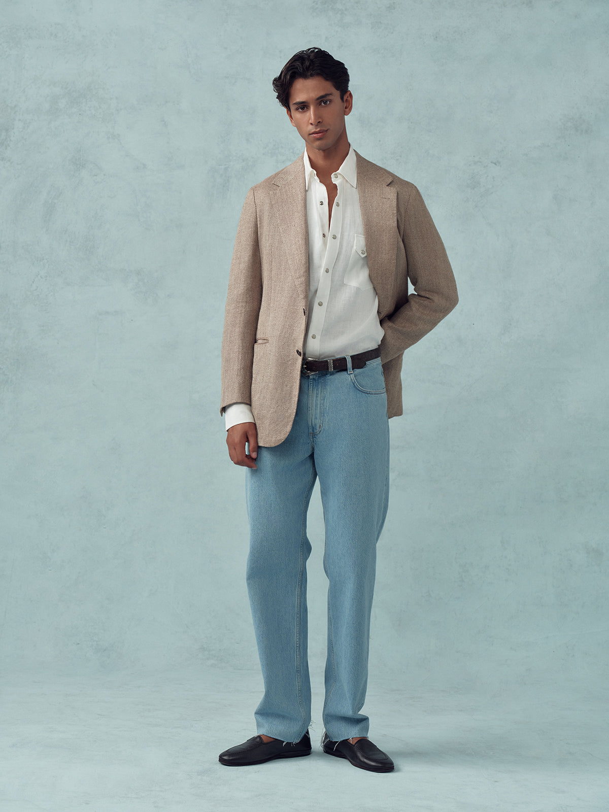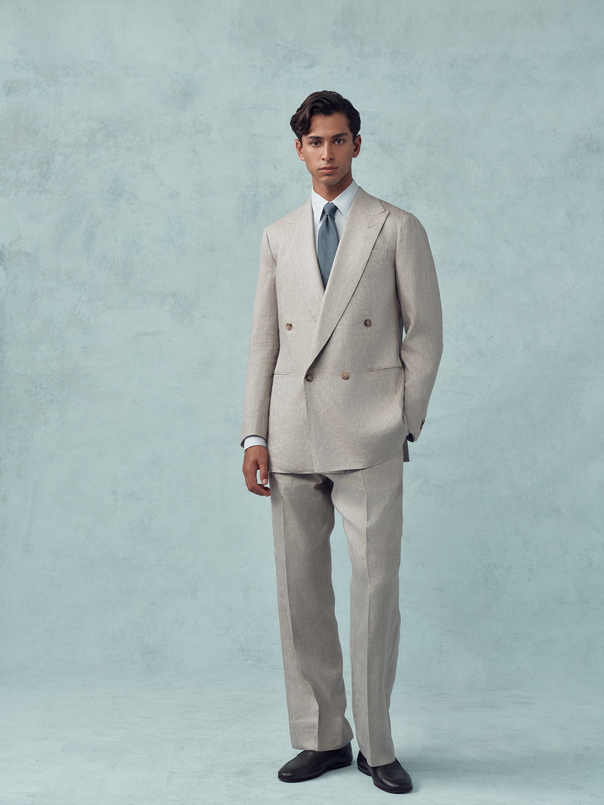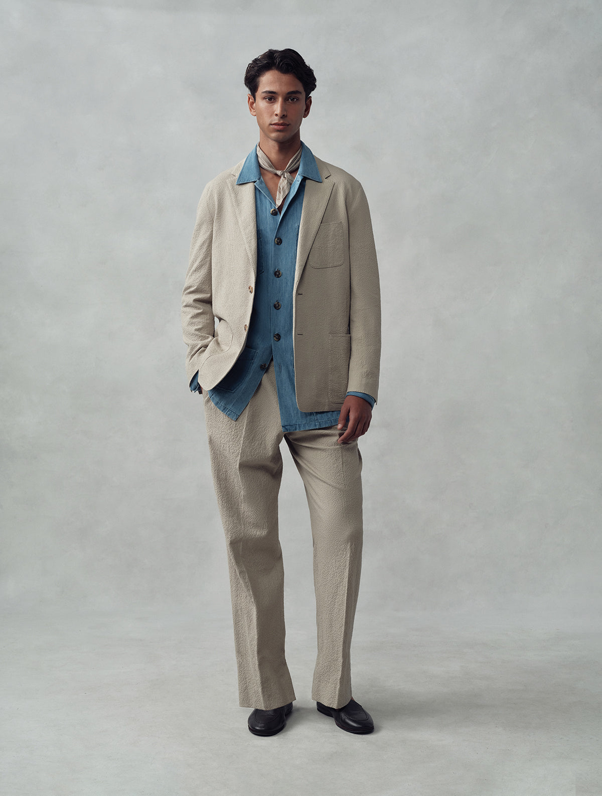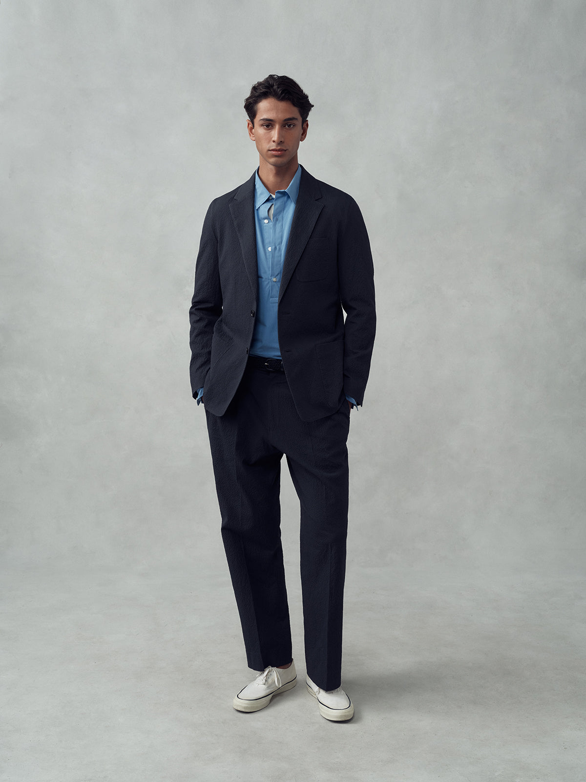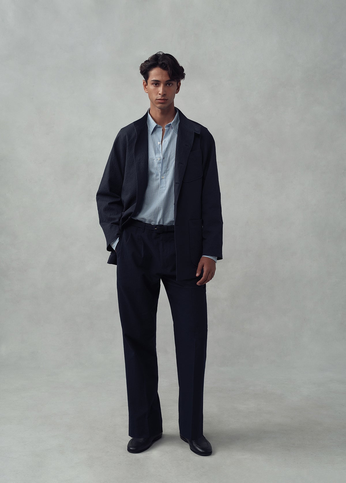 We introduce an Italian cotton-silk blend seersucker in the new ‘slack jacket’ model which comes in navy and taupe and has a matching double pleat chino - an elegant suit parallel with a softer more relaxed profile that dresses up and down as necessary. You can also pair the navy chino with a matching Corbu jacket, a new PJ favourite.