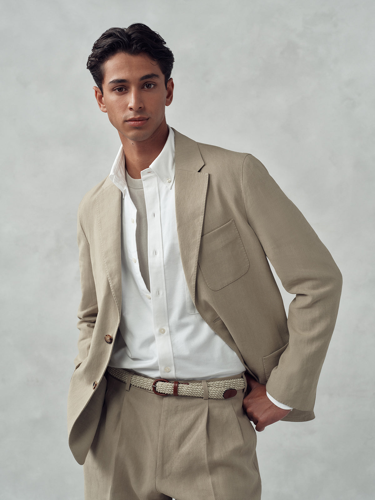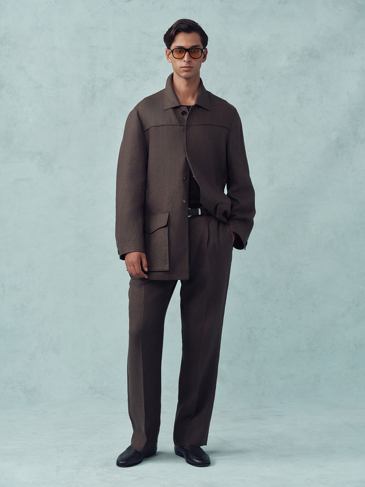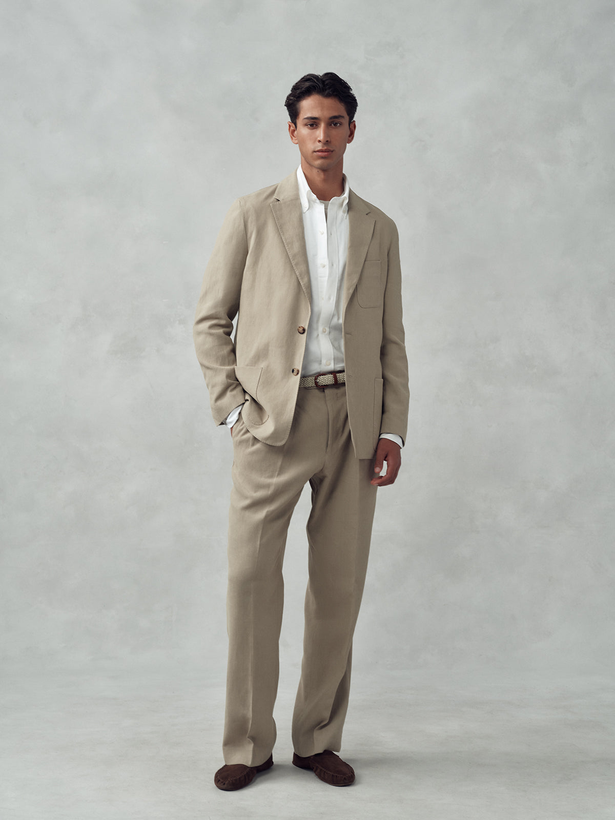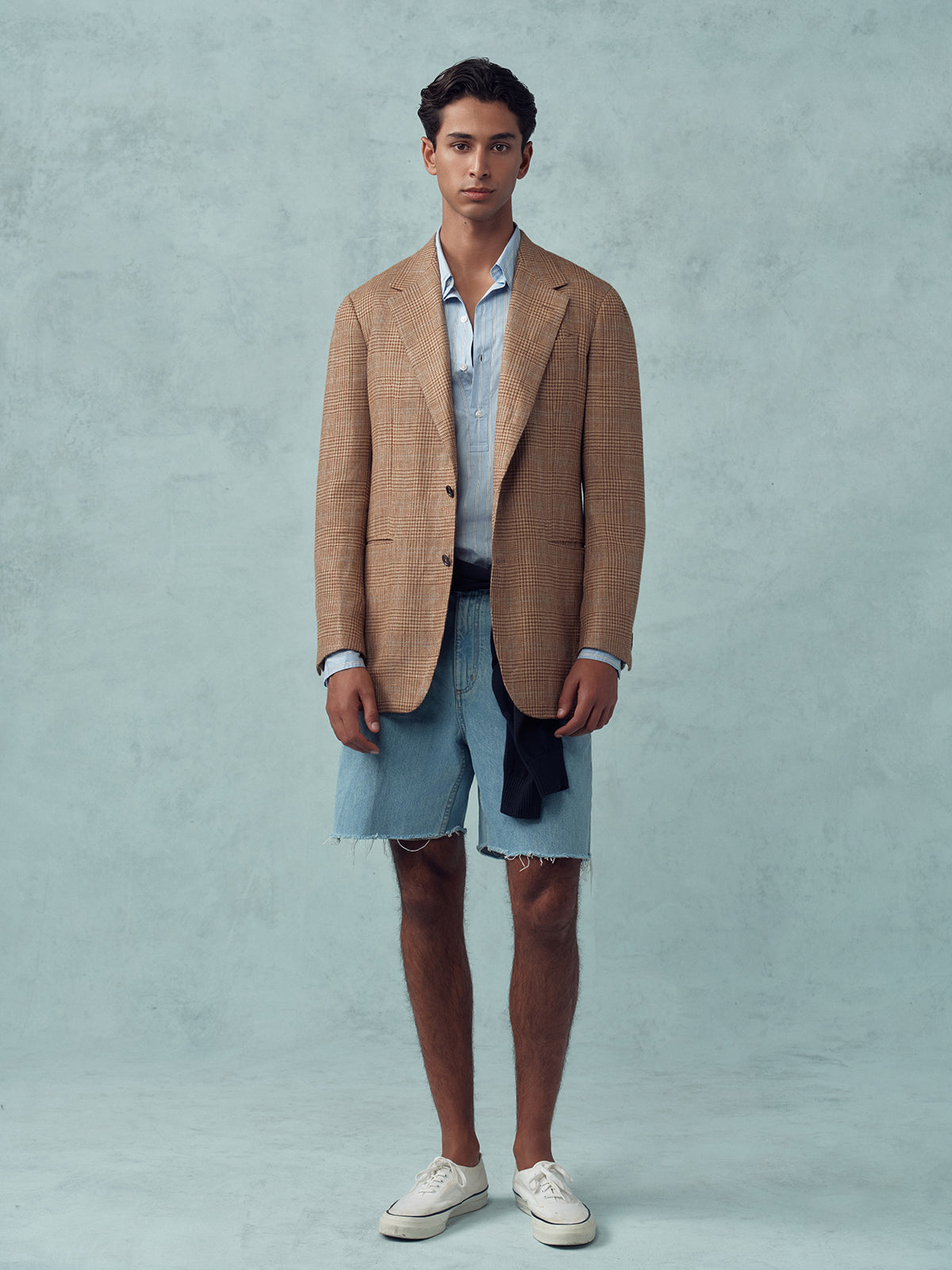 We introduce an Italian cotton-silk blend seersucker in the new ‘slack jacket’ model which comes in navy and taupe and has a matching double pleat chino - an elegant suit parallel with a softer more relaxed profile that dresses up and down as necessary. You can also pair the navy chino with a matching Corbu jacket, a new PJ favourite.