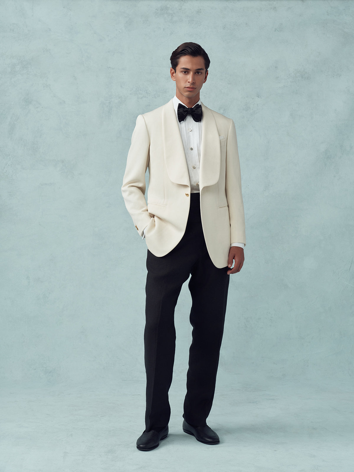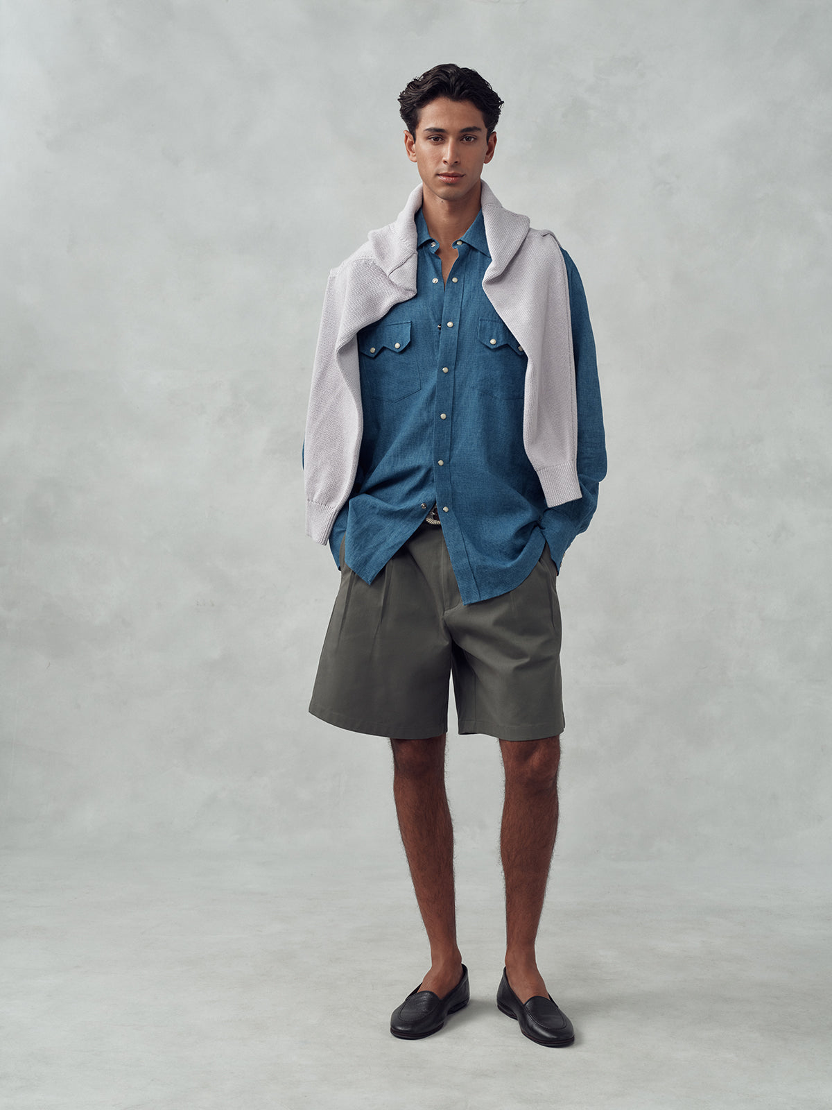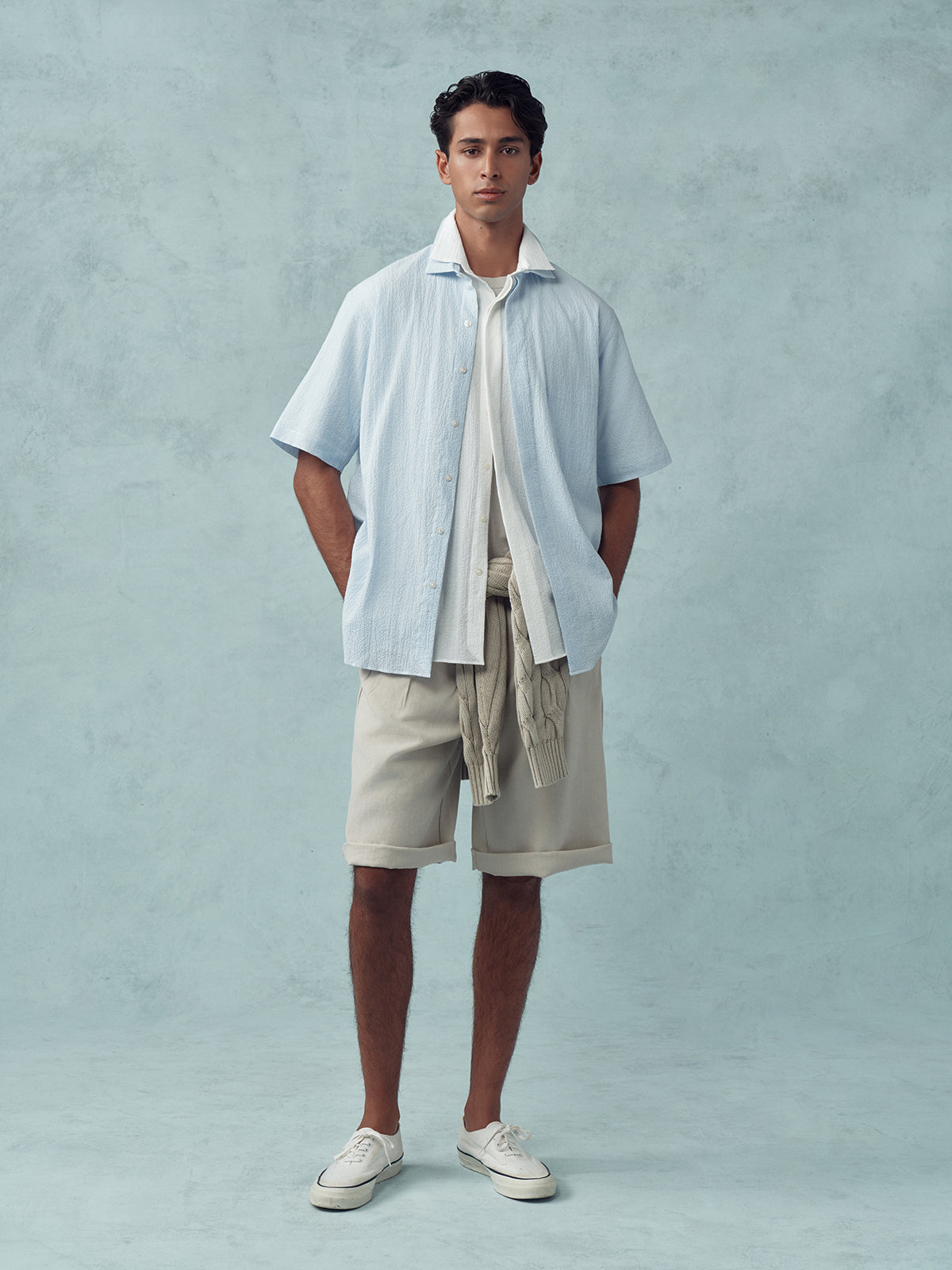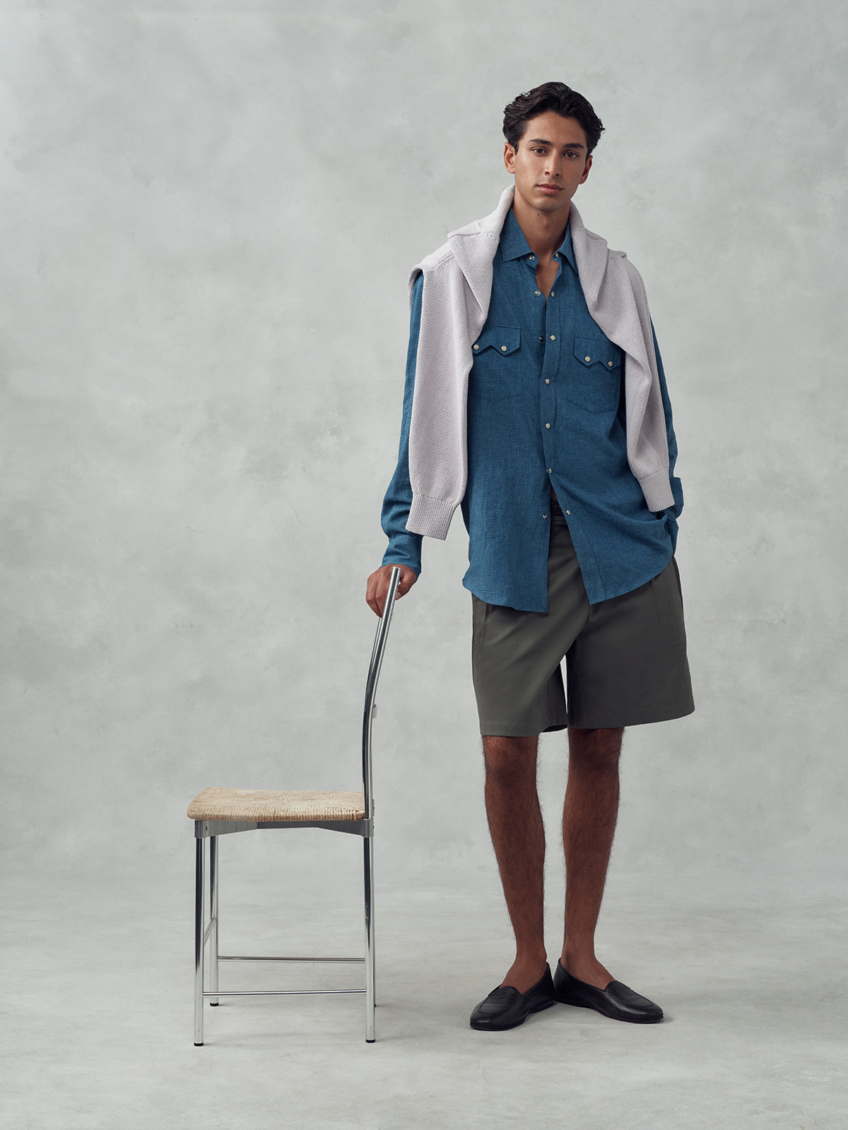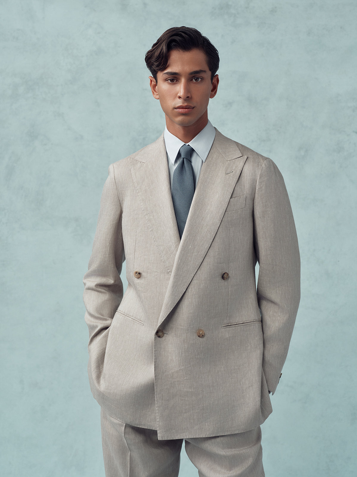 We introduce an Italian cotton-silk blend seersucker in the new ‘slack jacket’ model which comes in navy and taupe and has a matching double pleat chino - an elegant suit parallel with a softer more relaxed profile that dresses up and down as necessary. You can also pair the navy chino with a matching Corbu jacket, a new PJ favourite.