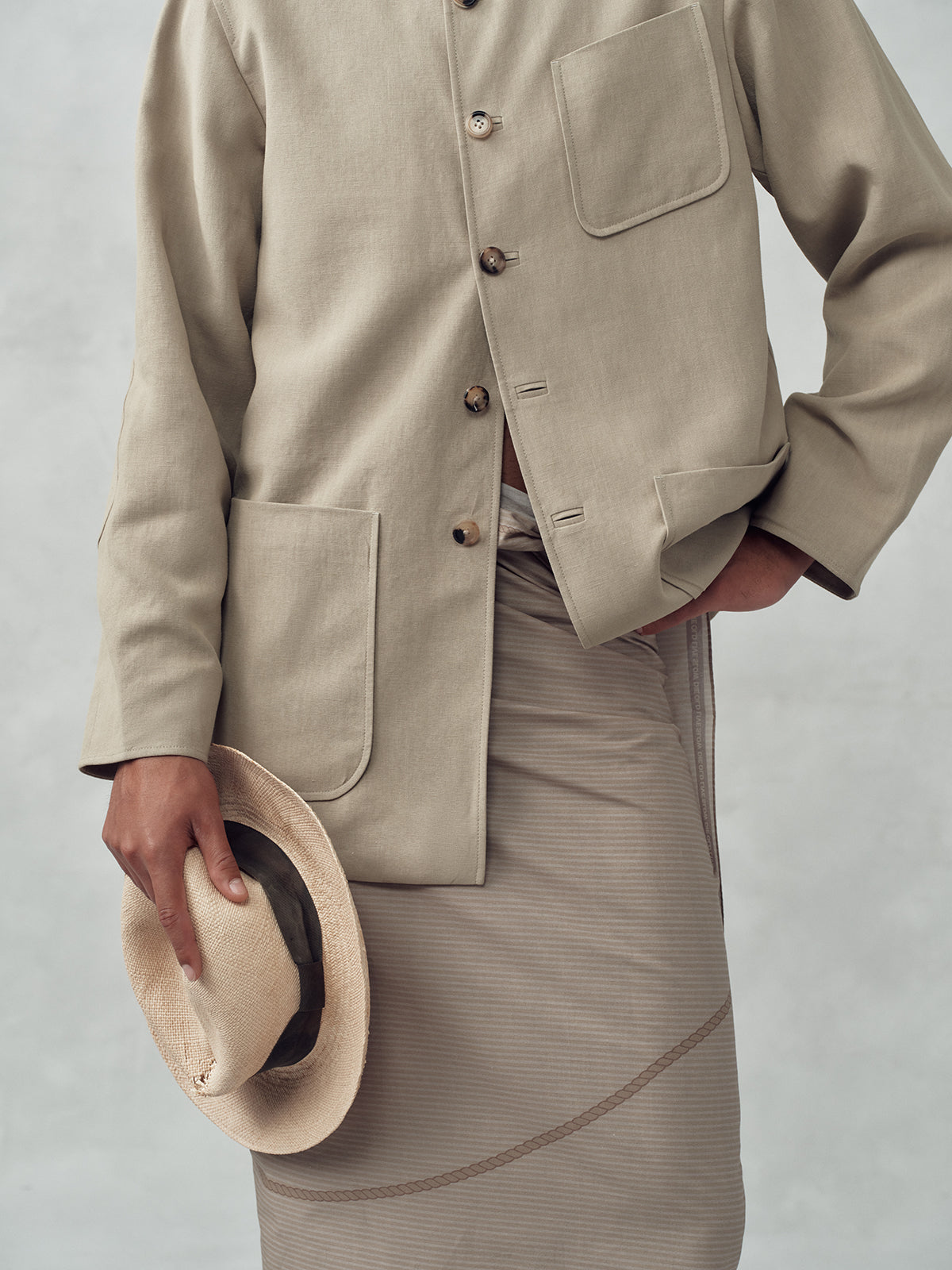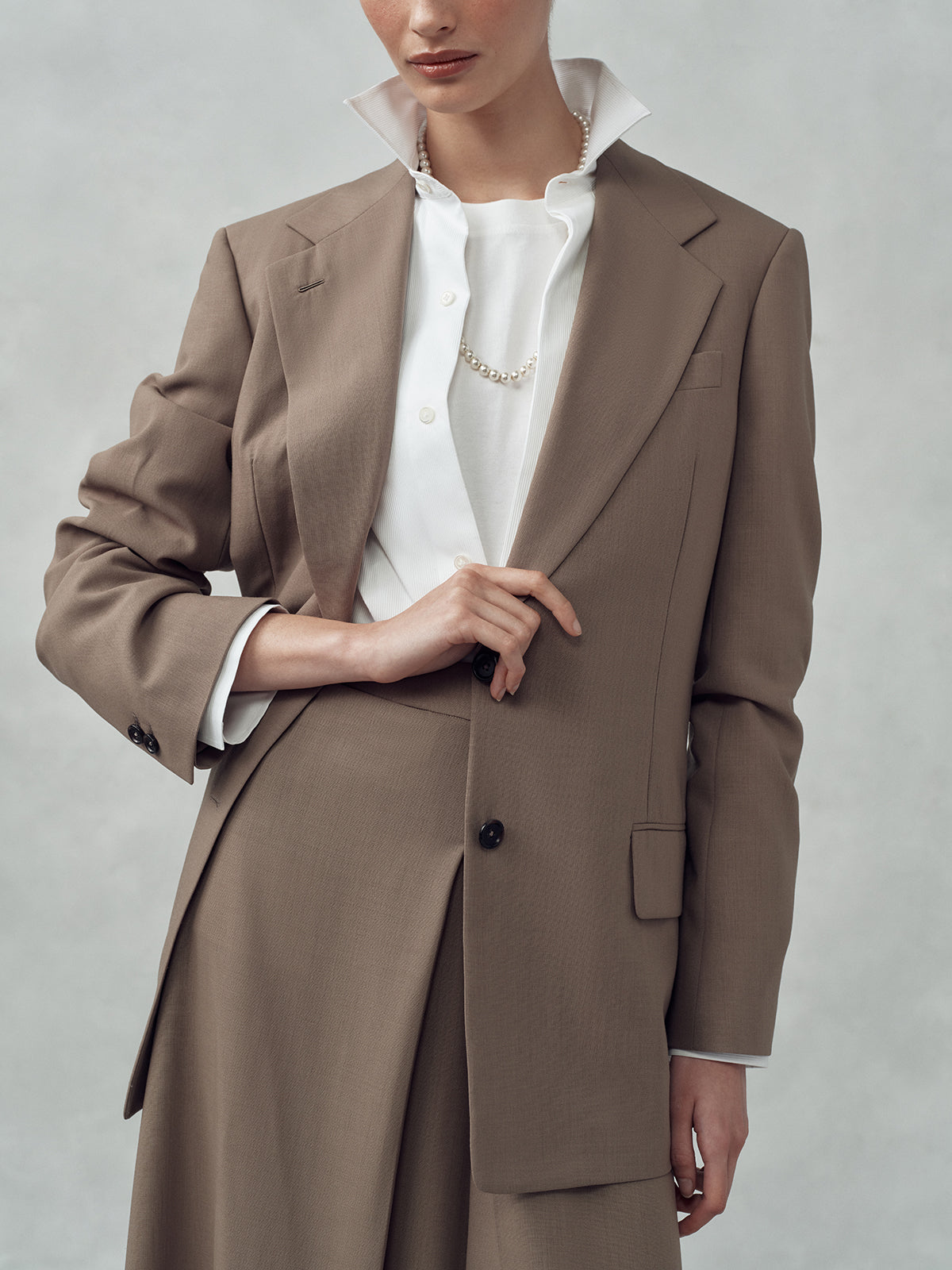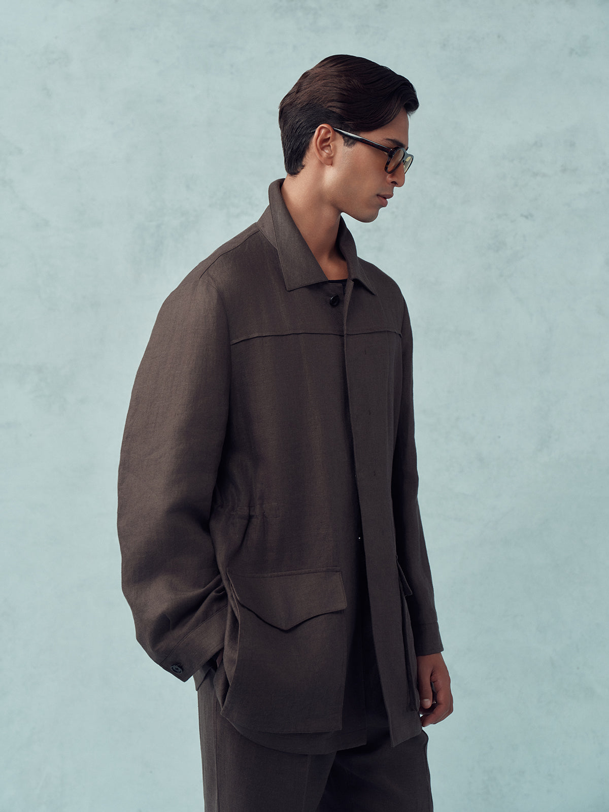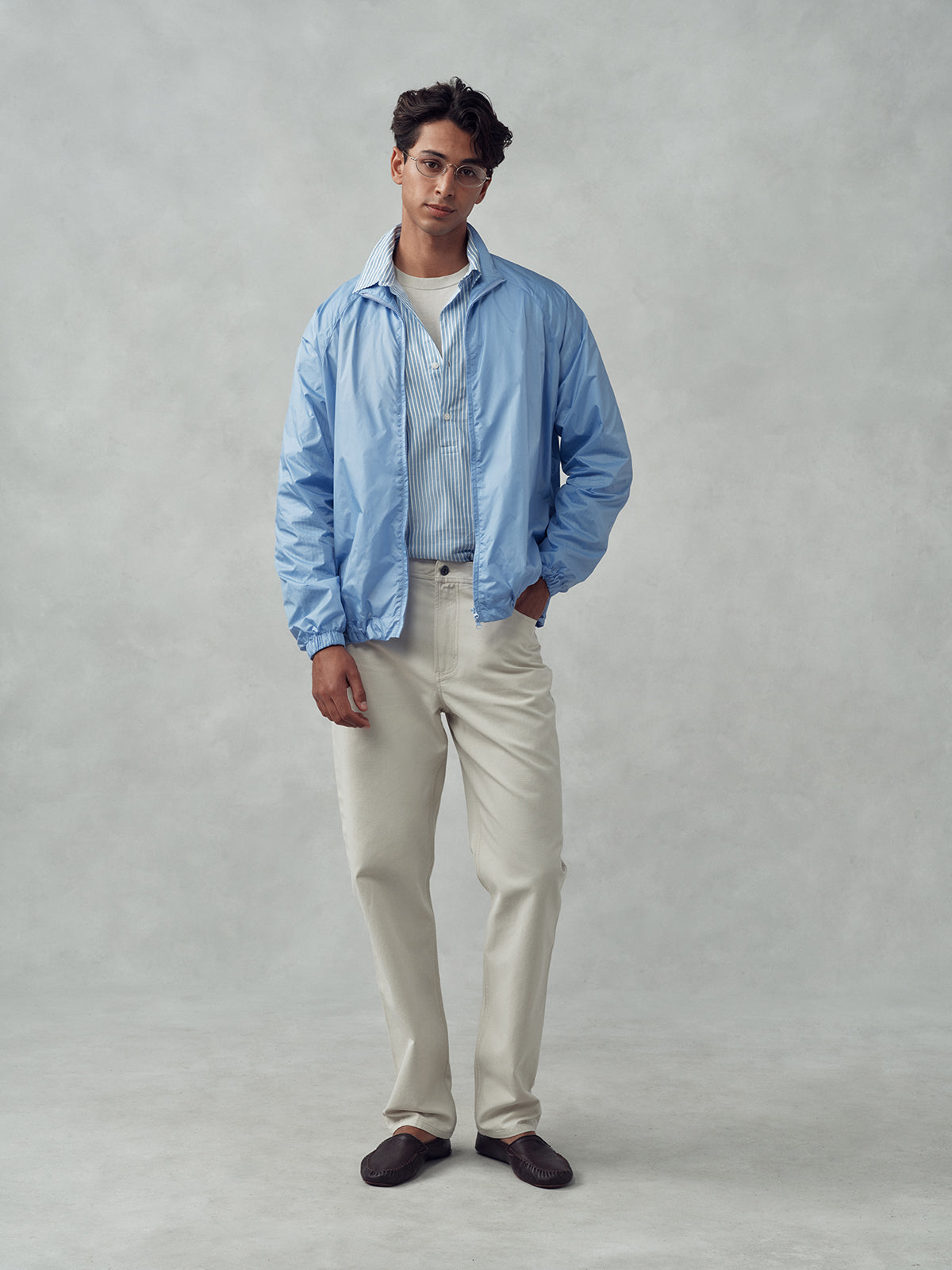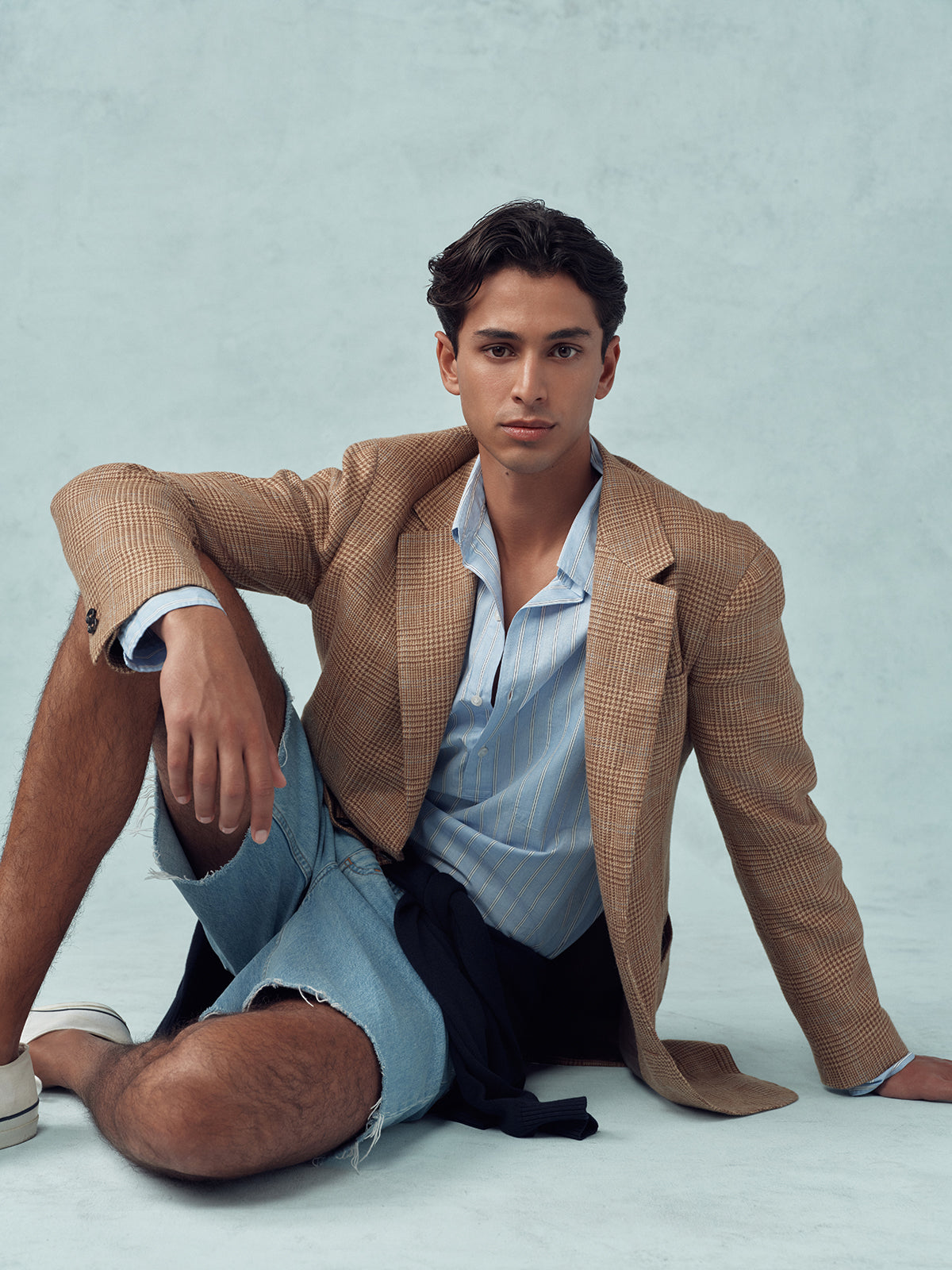 We introduce an Italian cotton-silk blend seersucker in the new ‘slack jacket’ model which comes in navy and taupe and has a matching double pleat chino - an elegant suit parallel with a softer more relaxed profile that dresses up and down as necessary. You can also pair the navy chino with a matching Corbu jacket, a new PJ favourite.
