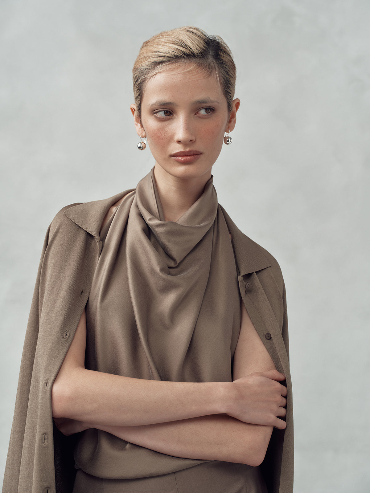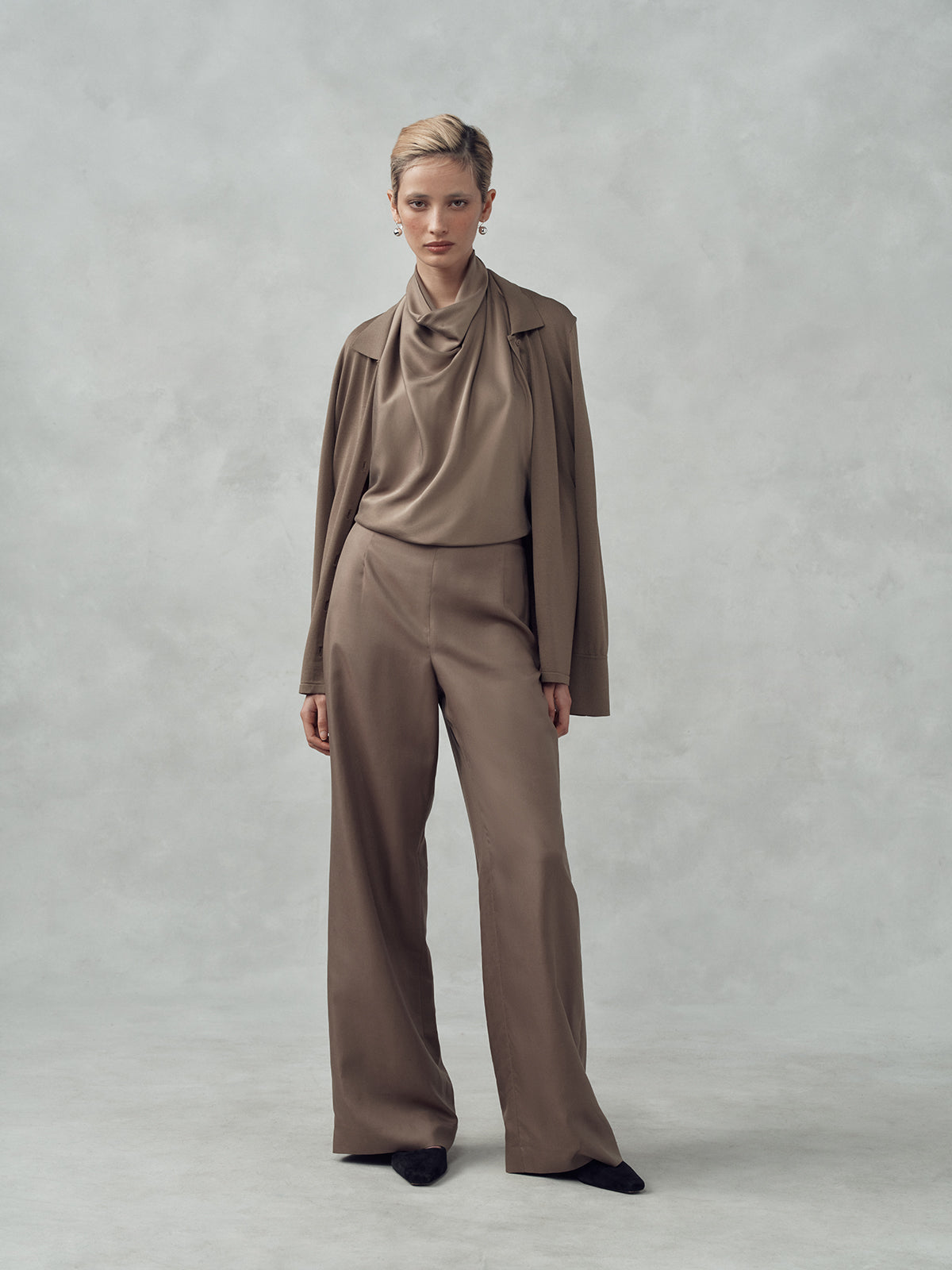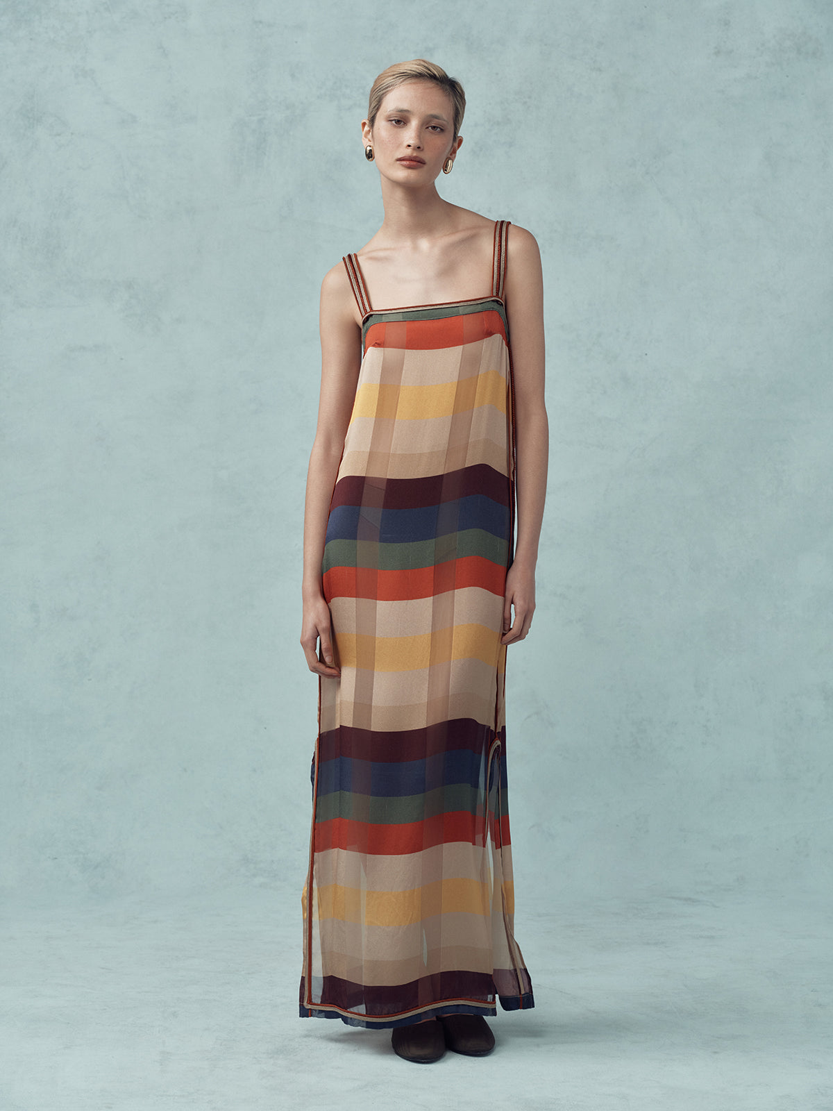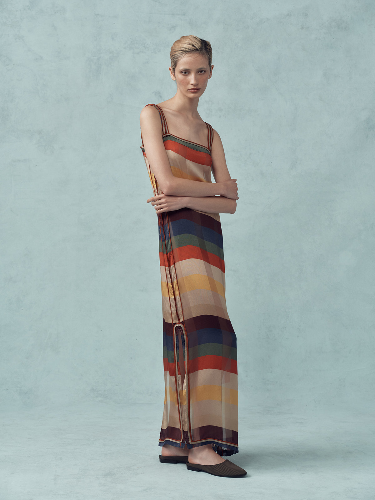 There is a spirit of play in the simple shapes of the Christy series featuring a shift, crop shirt and top in contrast to the Bebe series which uses the finest silk to embellish its deeply antique-hued Venetian stripes and lavishly braided details. The Edie series deploys knitwear at its finest, vertical sheer self striping paired with woven trims and ties exude femininity, as does the slinky Margherita pant and cowl neck in sand-milled silk.
