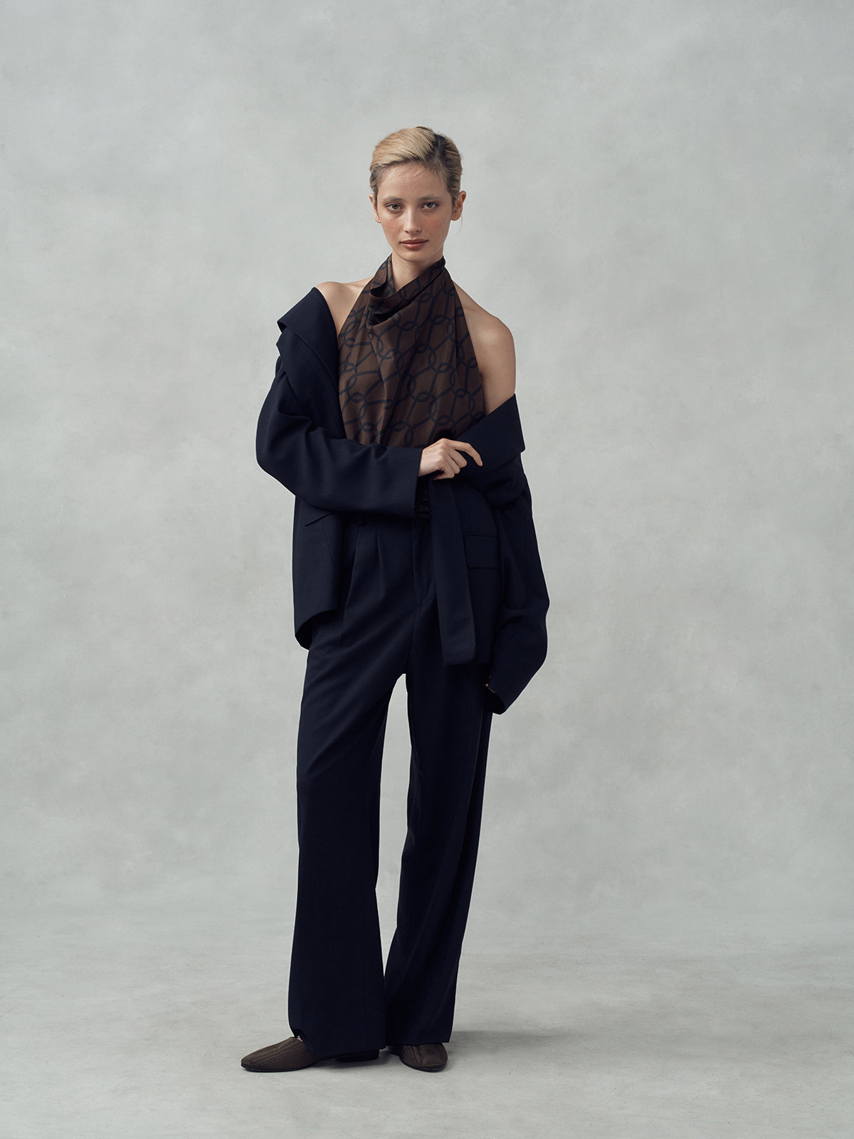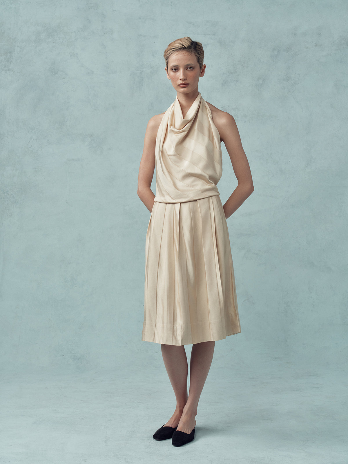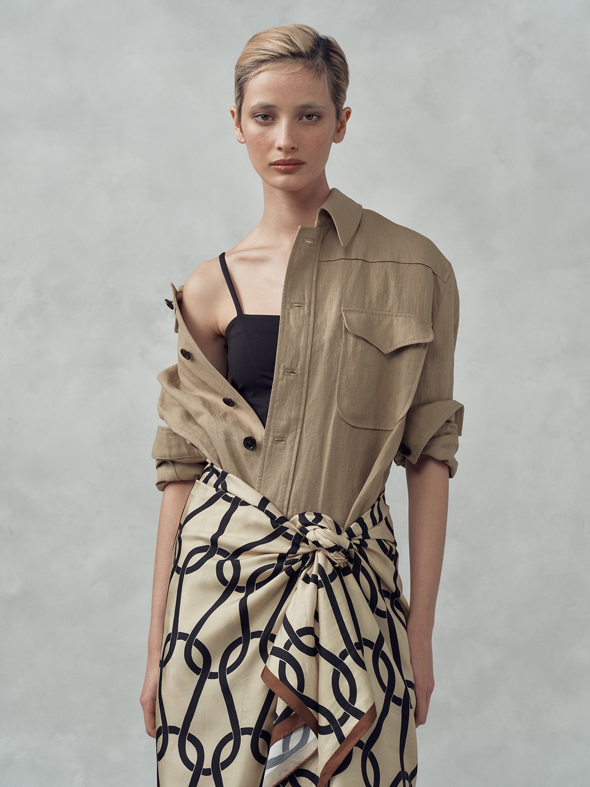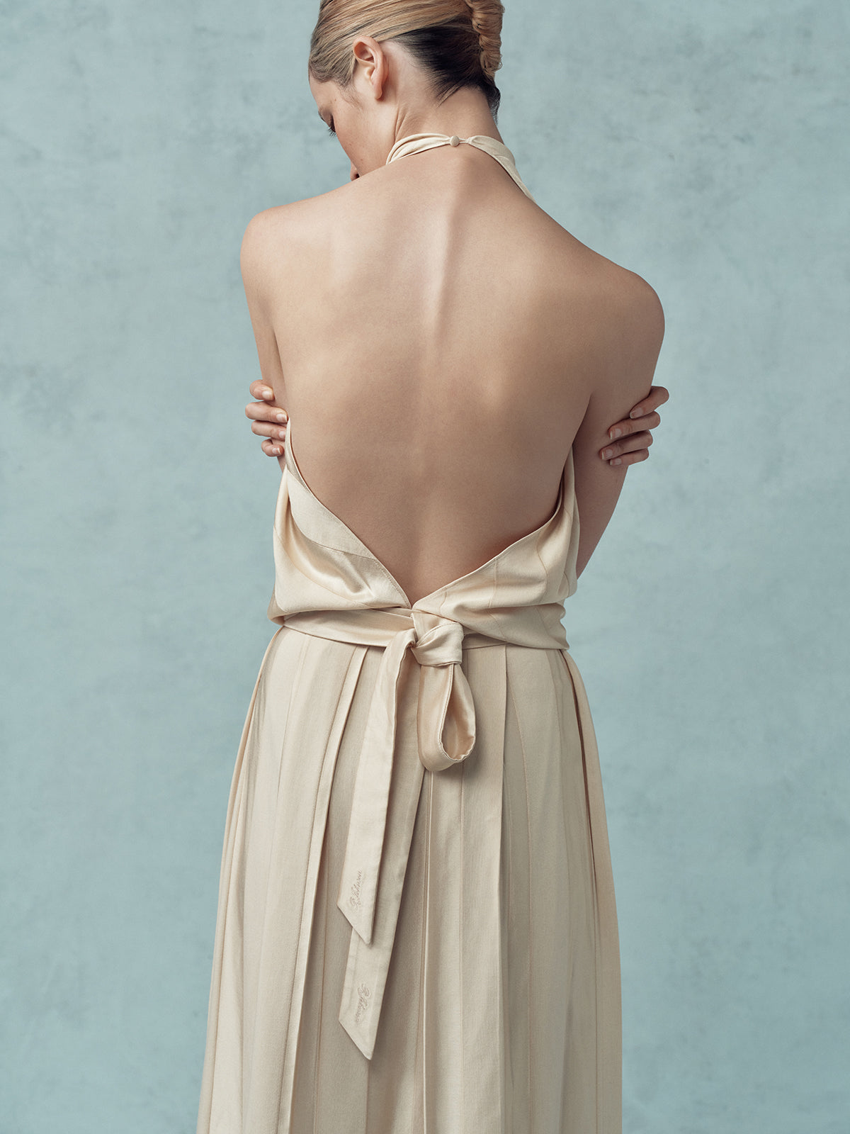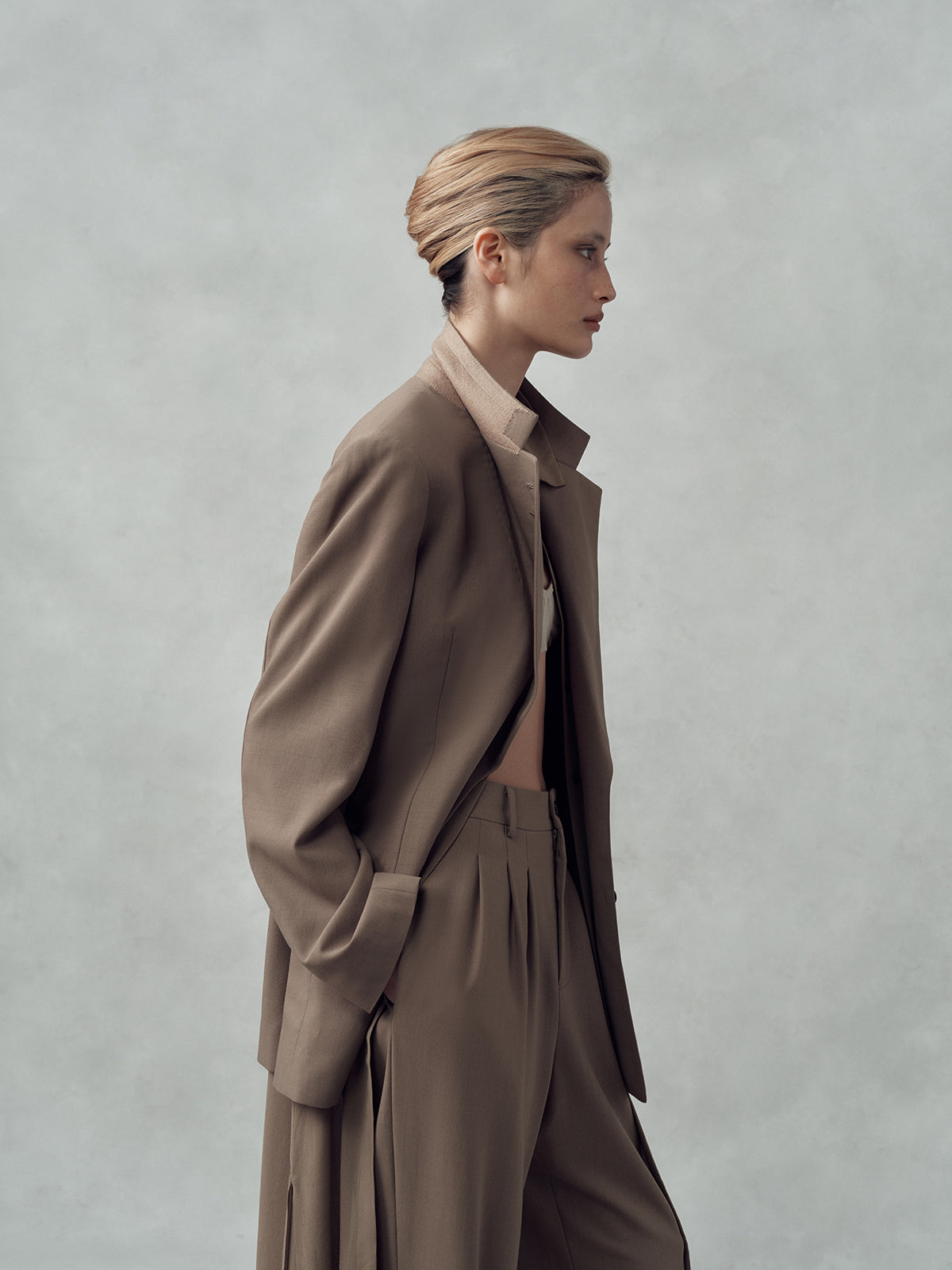 There is a spirit of play in the simple shapes of the Christy series featuring a shift, crop shirt and top in contrast to the Bebe series which uses the finest silk to embellish its deeply antique-hued Venetian stripes and lavishly braided details. The Edie series deploys knitwear at its finest, vertical sheer self striping paired with woven trims and ties exude femininity, as does the slinky Margherita pant and cowl neck in sand-milled silk.