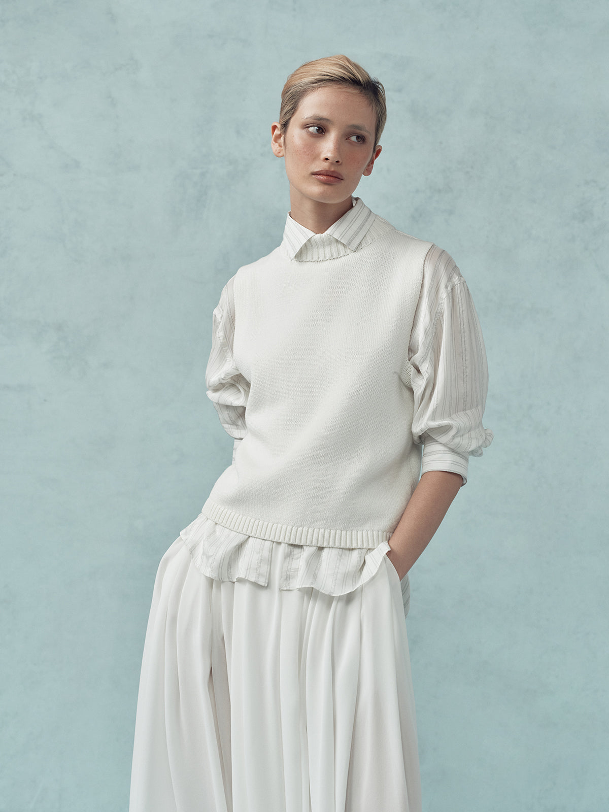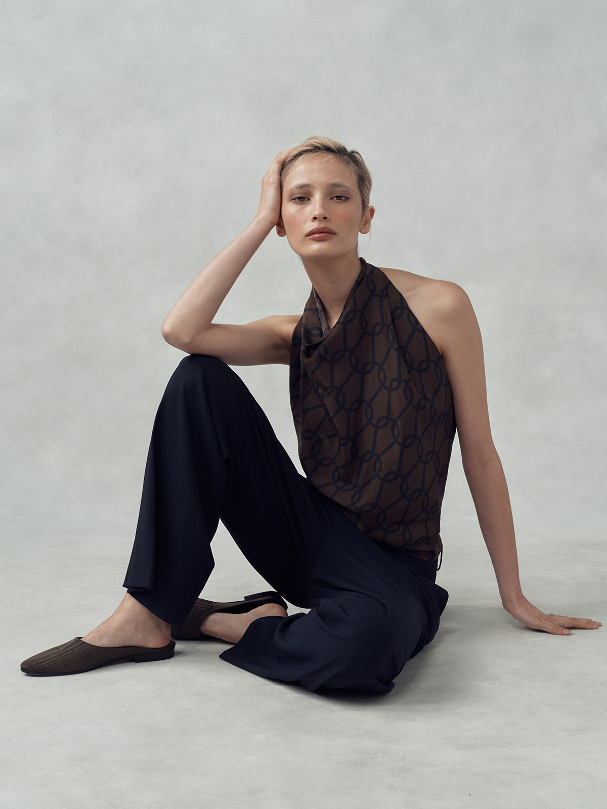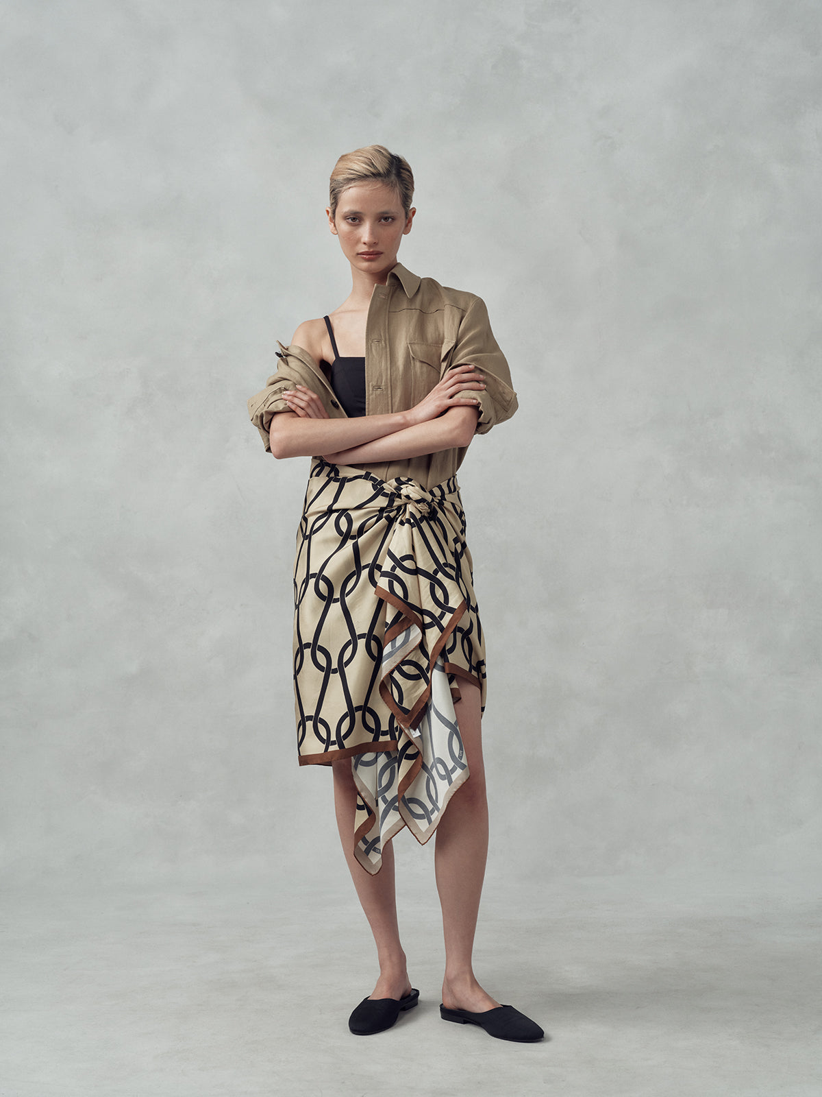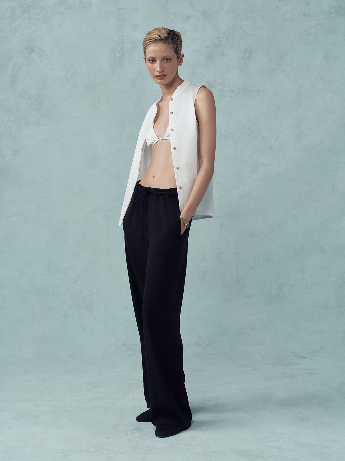 There is a spirit of play in the simple shapes of the Christy series featuring a shift, crop shirt and top in contrast to the Bebe series which uses the finest silk to embellish its deeply antique-hued Venetian stripes and lavishly braided details. The Edie series deploys knitwear at its finest, vertical sheer self striping paired with woven trims and ties exude femininity, as does the slinky Margherita pant and cowl neck in sand-milled silk.