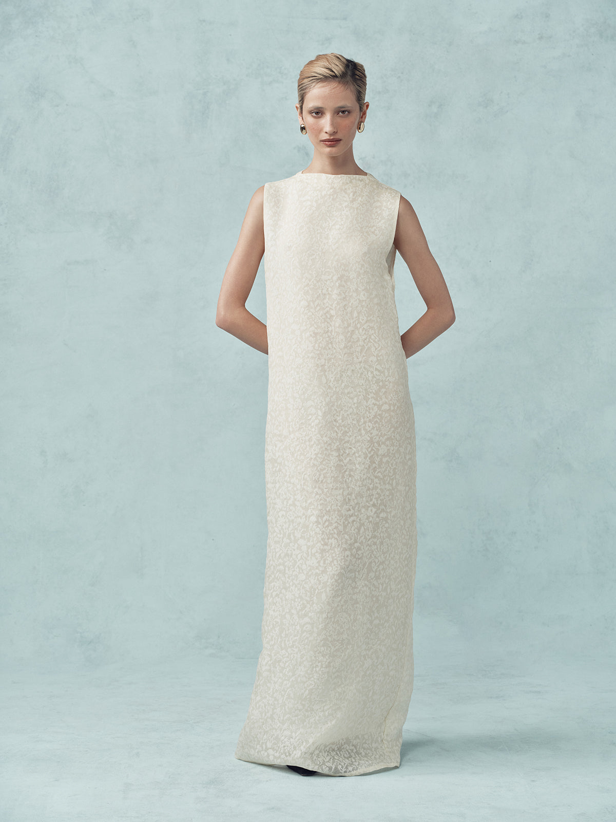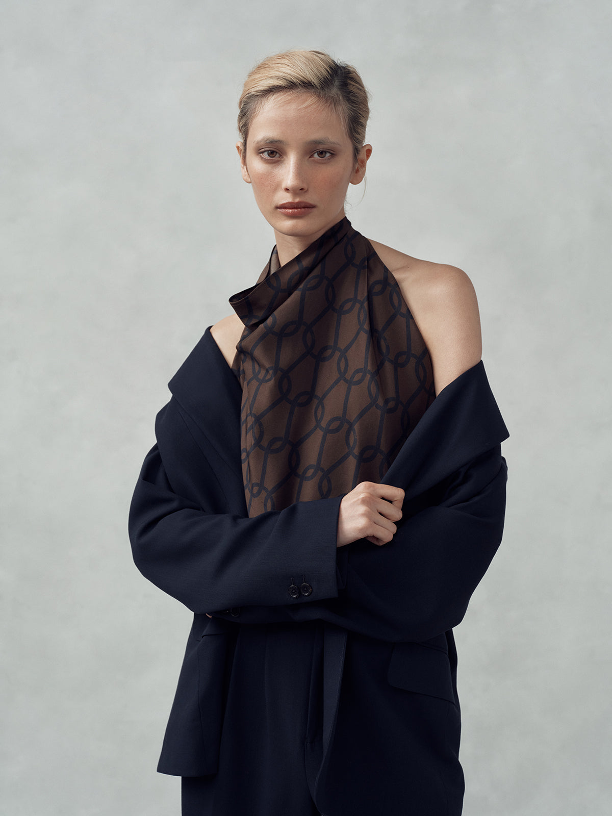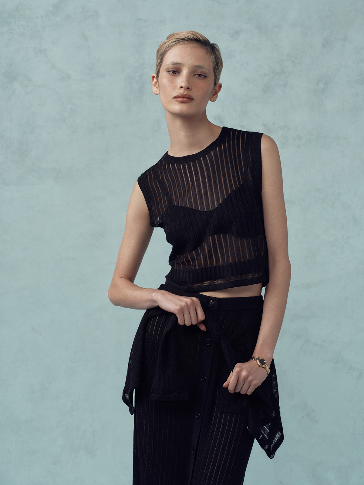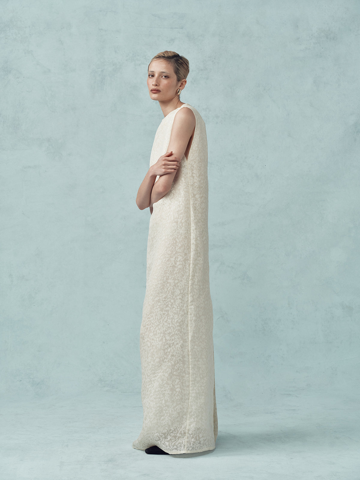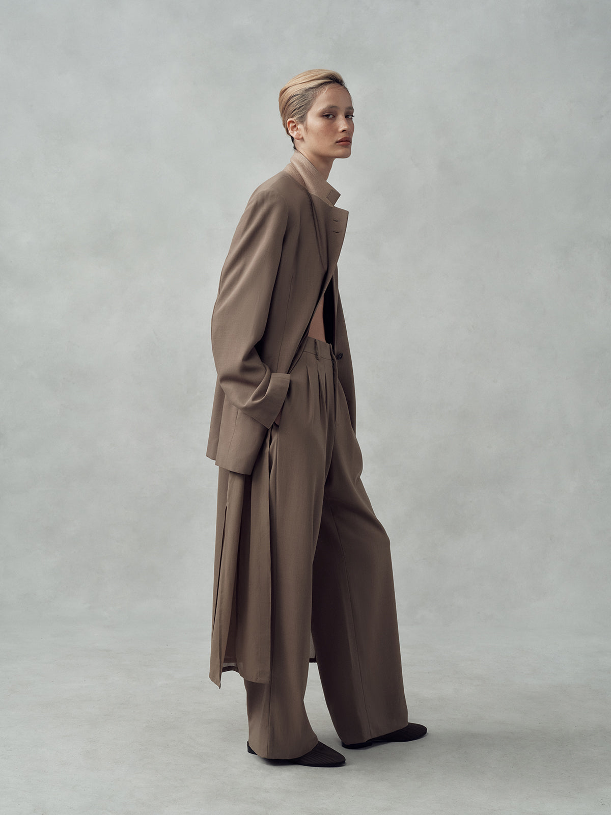 There is a spirit of play in the simple shapes of the Christy series featuring a shift, crop shirt and top in contrast to the Bebe series which uses the finest silk to embellish its deeply antique-hued Venetian stripes and lavishly braided details. The Edie series deploys knitwear at its finest, vertical sheer self striping paired with woven trims and ties exude femininity, as does the slinky Margherita pant and cowl neck in sand-milled silk.