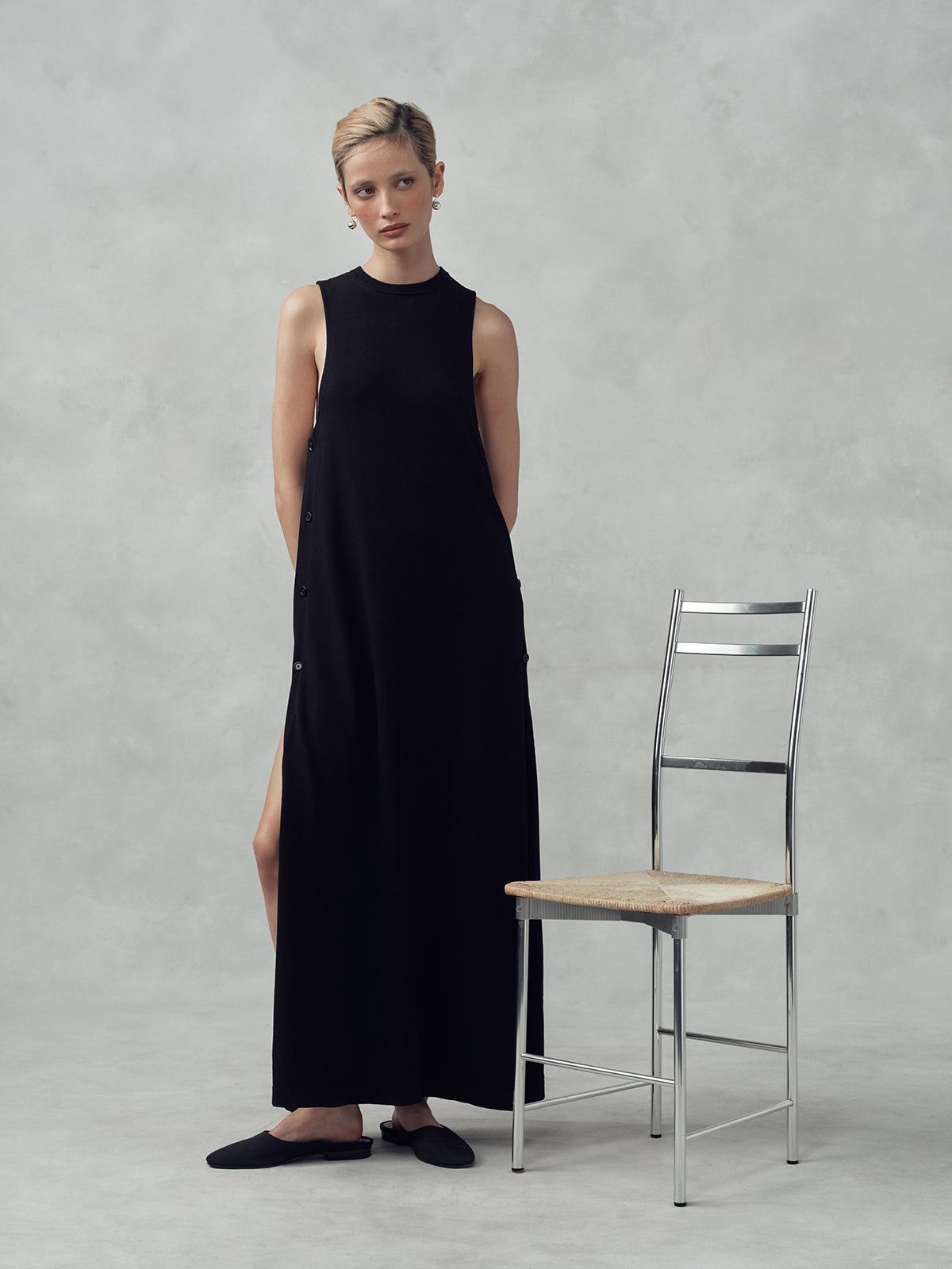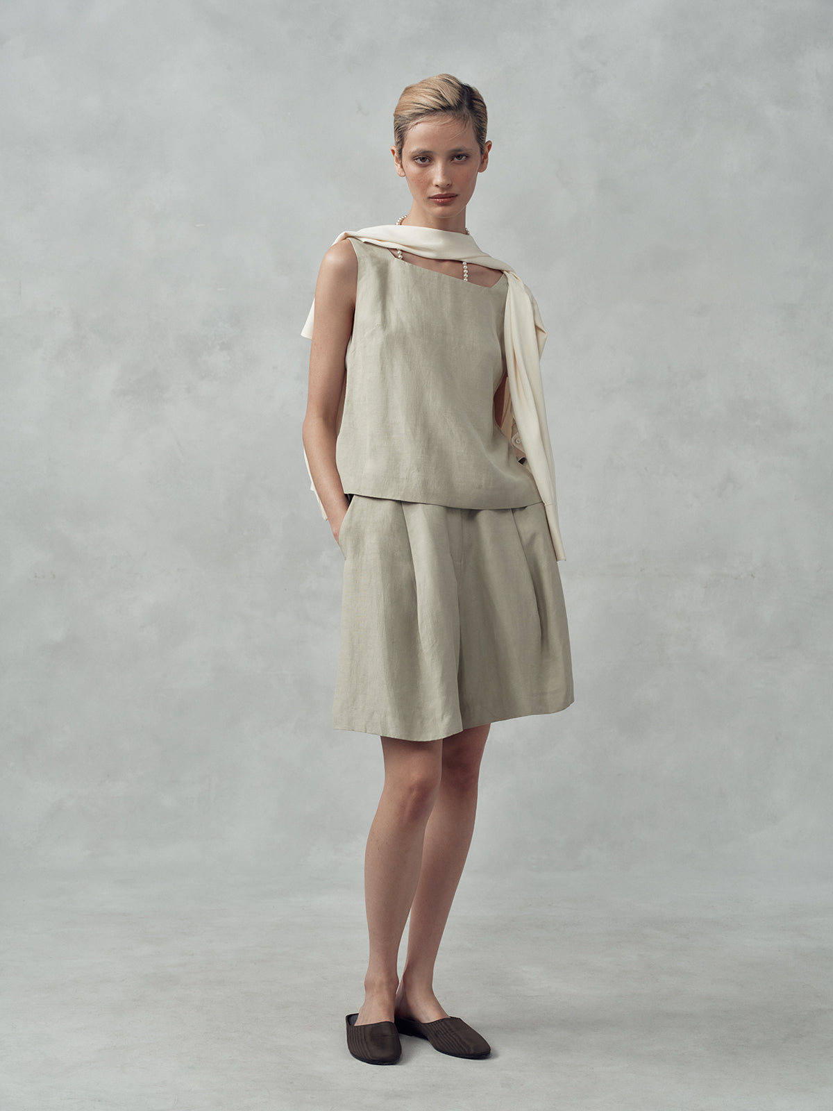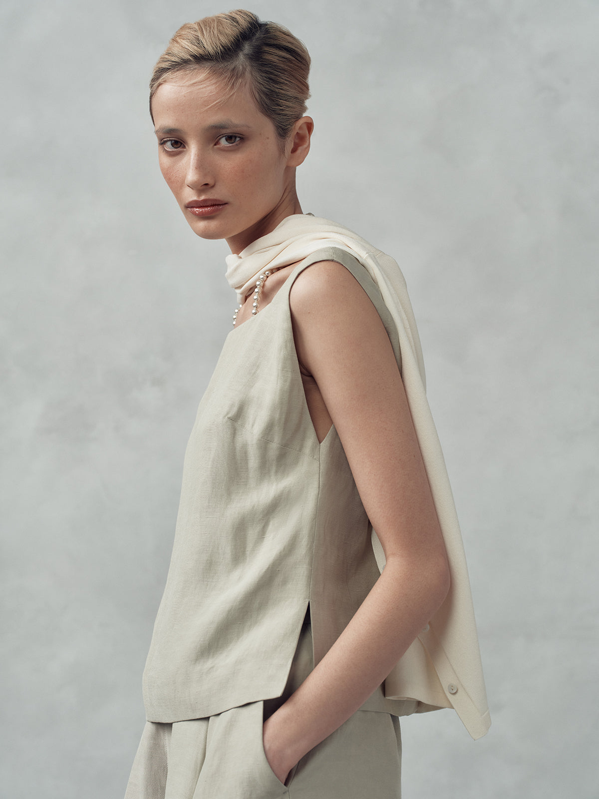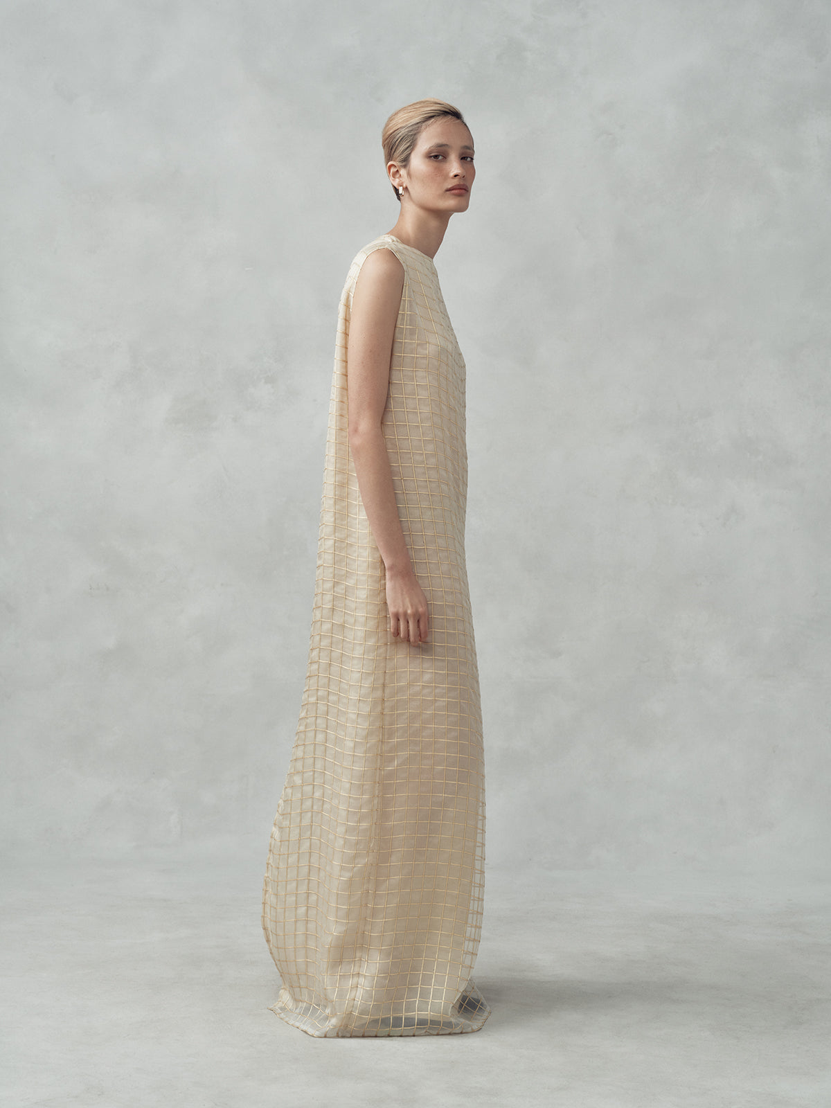 There is a spirit of play in the simple shapes of the Christy series featuring a shift, crop shirt and top in contrast to the Bebe series which uses the finest silk to embellish its deeply antique-hued Venetian stripes and lavishly braided details. The Edie series deploys knitwear at its finest, vertical sheer self striping paired with woven trims and ties exude femininity, as does the slinky Margherita pant and cowl neck in sand-milled silk.