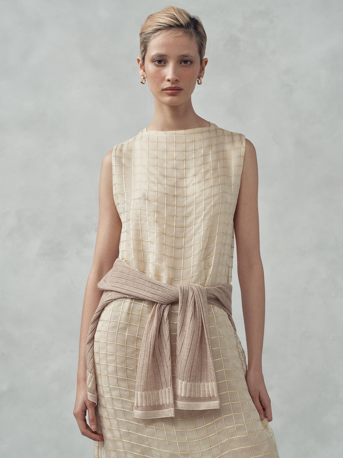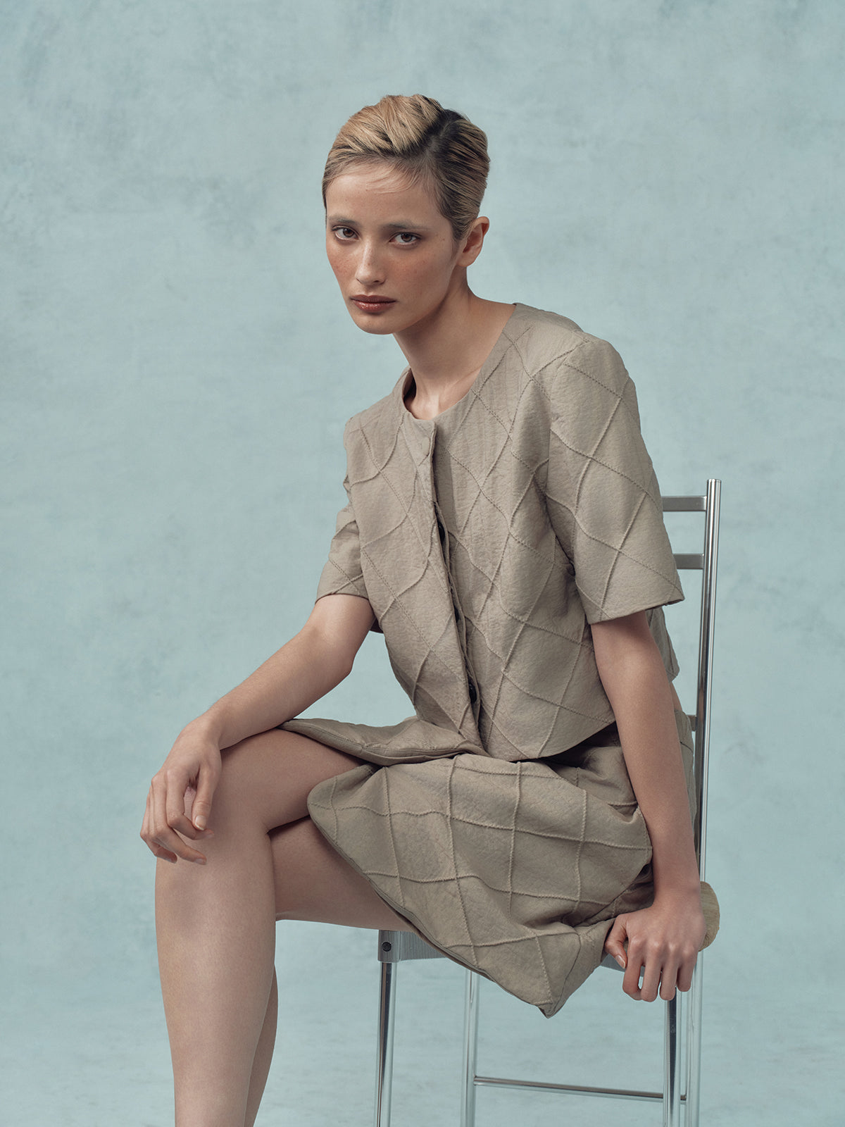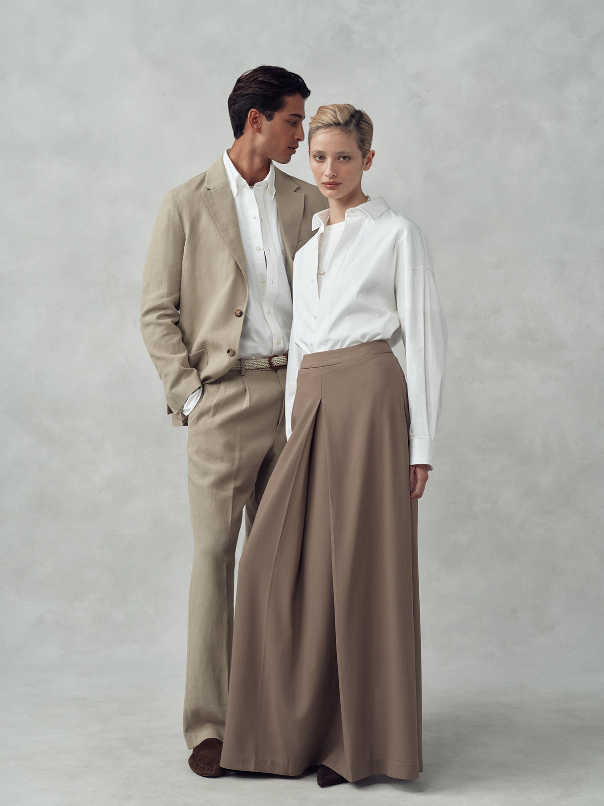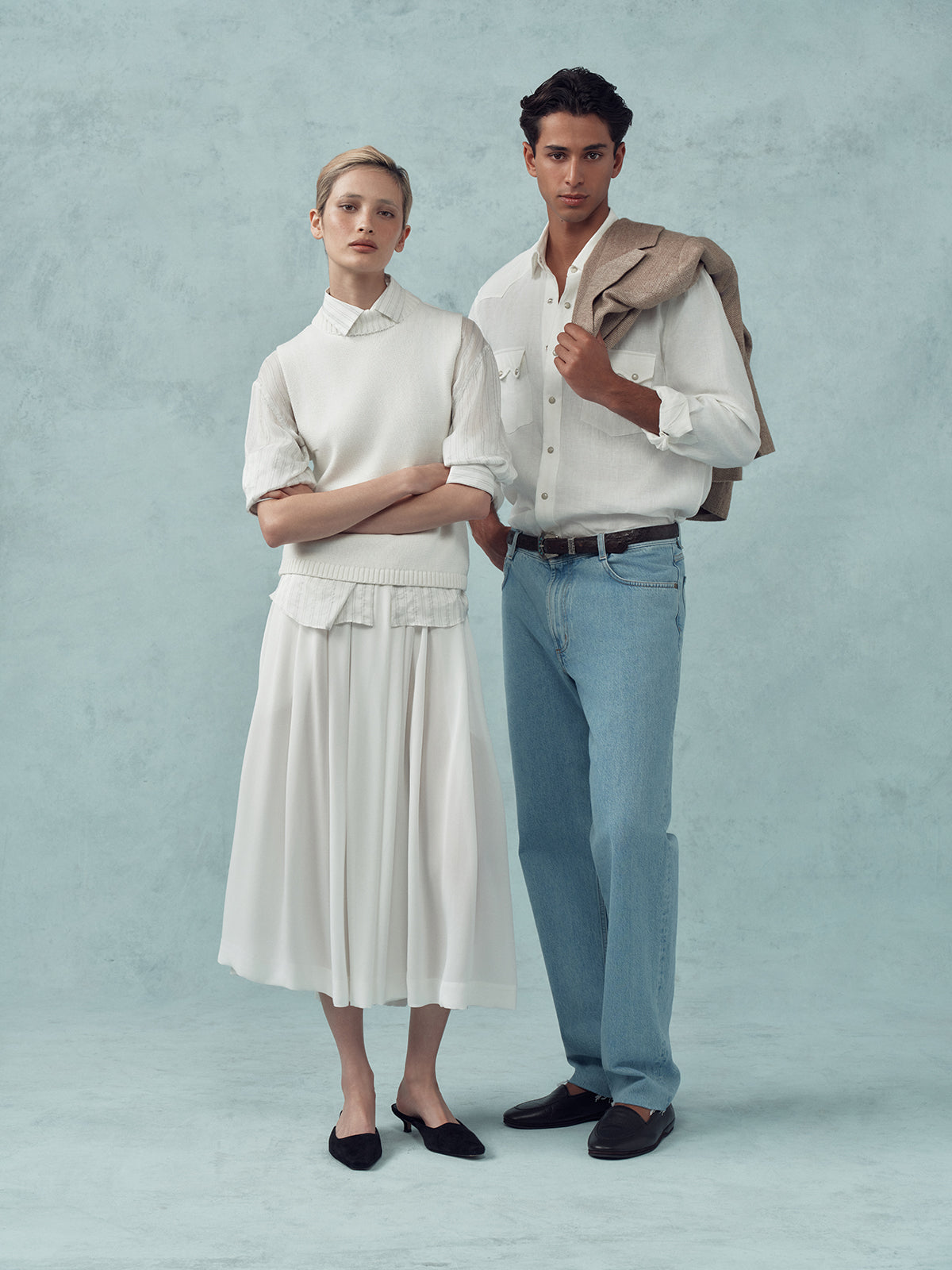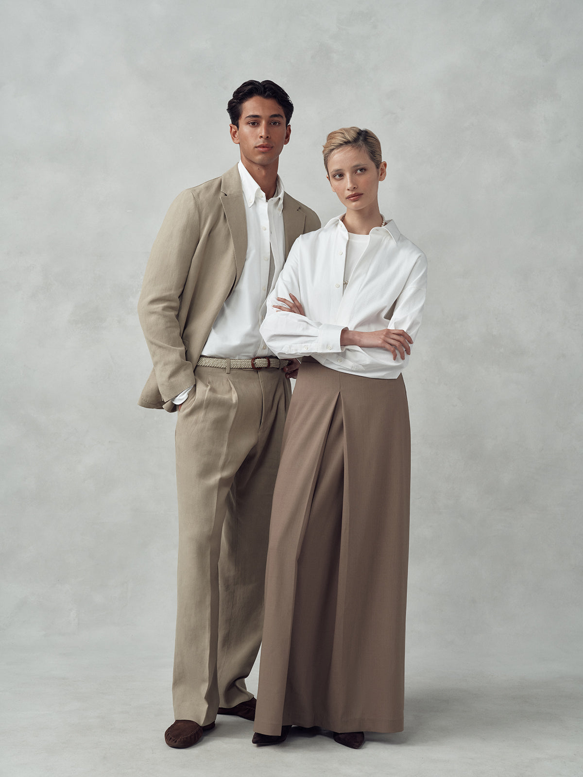 This season’s women’s collection is defined by shades of post-war restraint, details are fine, reductive yet delicate. Take for example the Flo jacket and skirt, with its intriguing crisscross-embroidered fabric or the Tia series with its extraordinarily fine gold jacquard silk window-pane check. You will find culottes, pedal pushers and capri pants (of sorts) in their most tasteful and elegant guises.