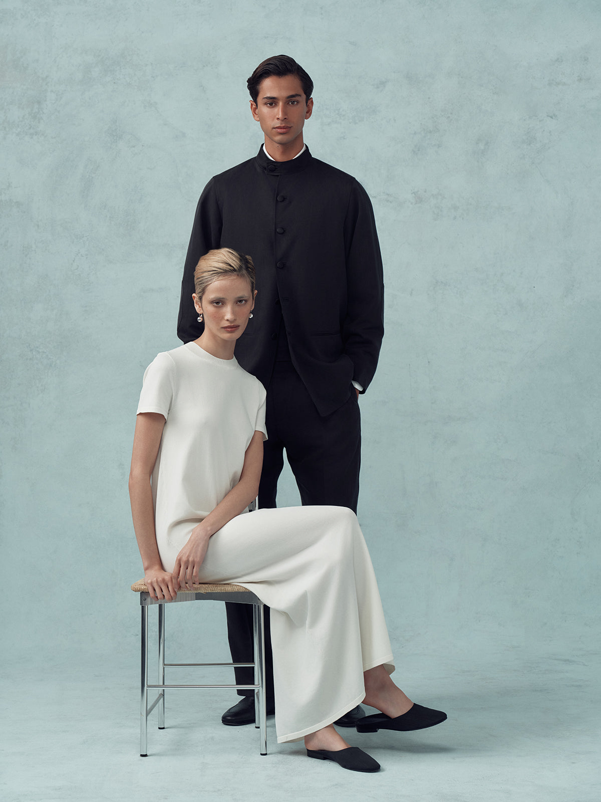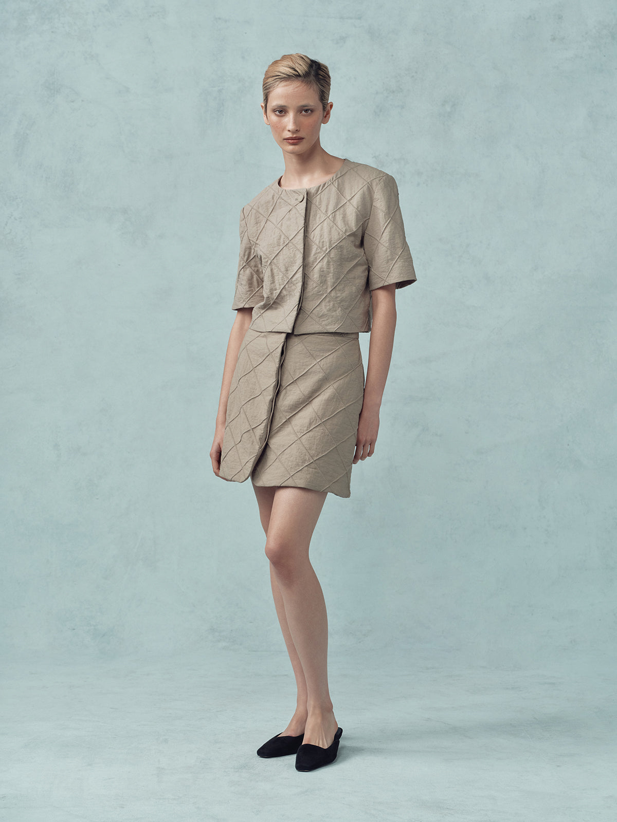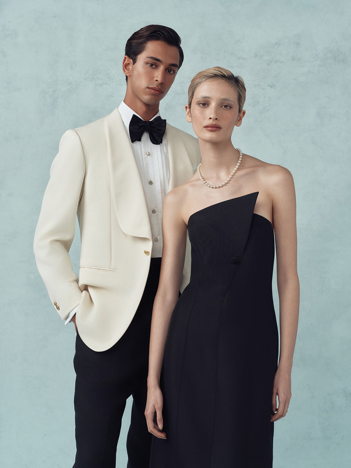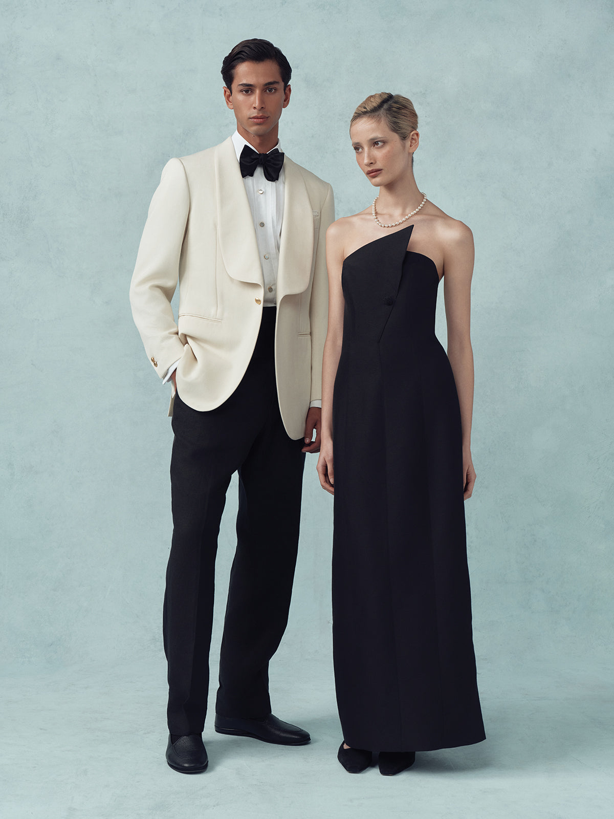 This season’s women’s collection is defined by shades of post-war restraint, details are fine, reductive yet delicate. Take for example the Flo jacket and skirt, with its intriguing crisscross-embroidered fabric or the Tia series with its extraordinarily fine gold jacquard silk window-pane check. You will find culottes, pedal pushers and capri pants (of sorts) in their most tasteful and elegant guises.