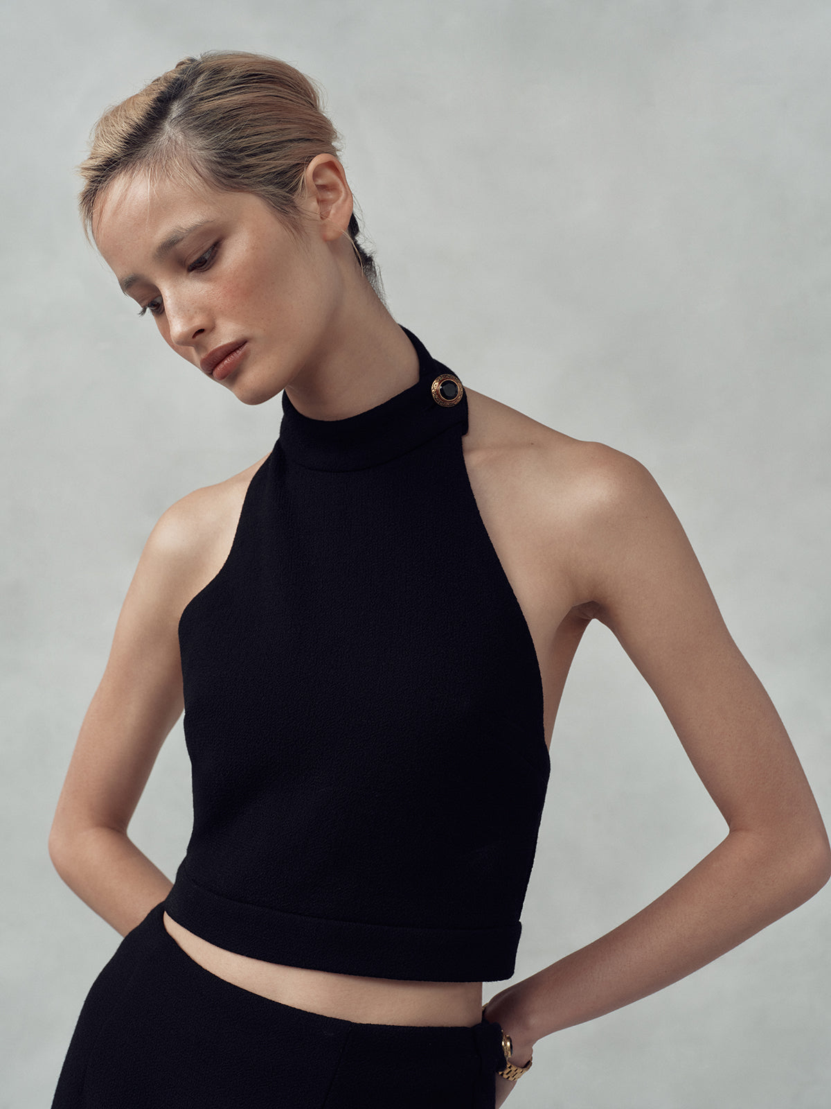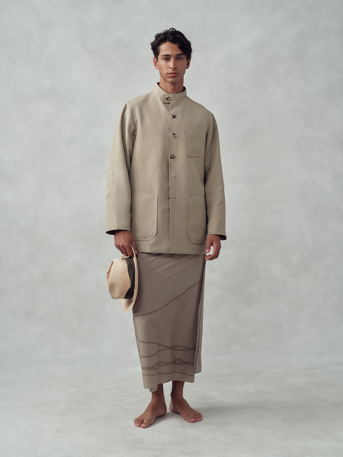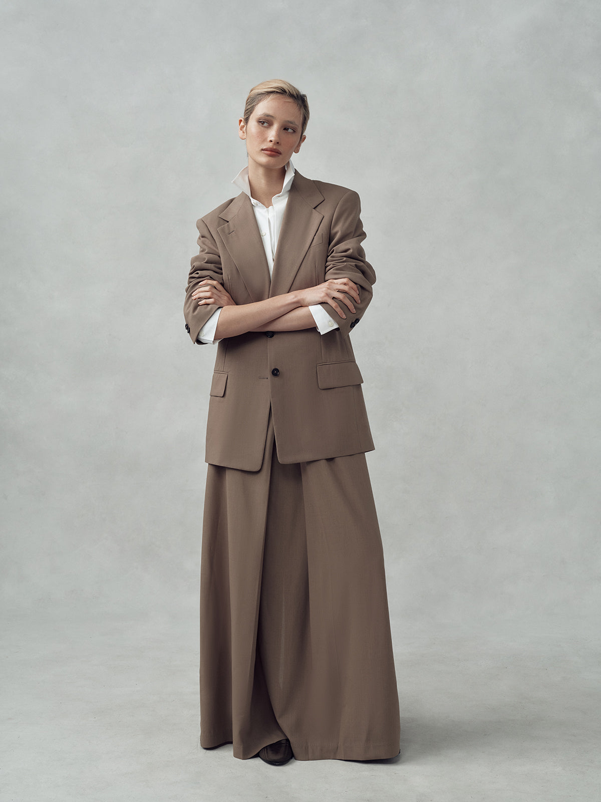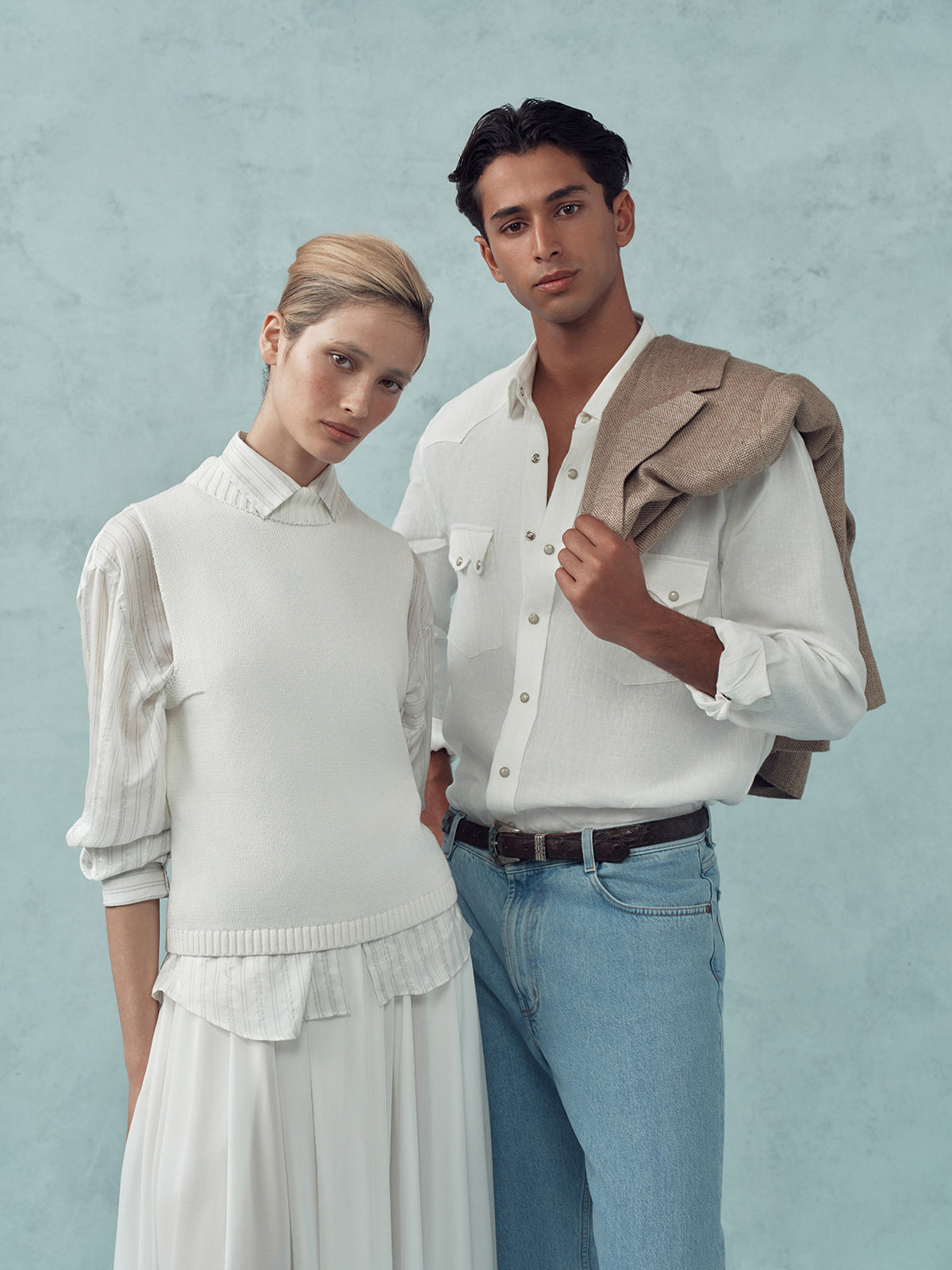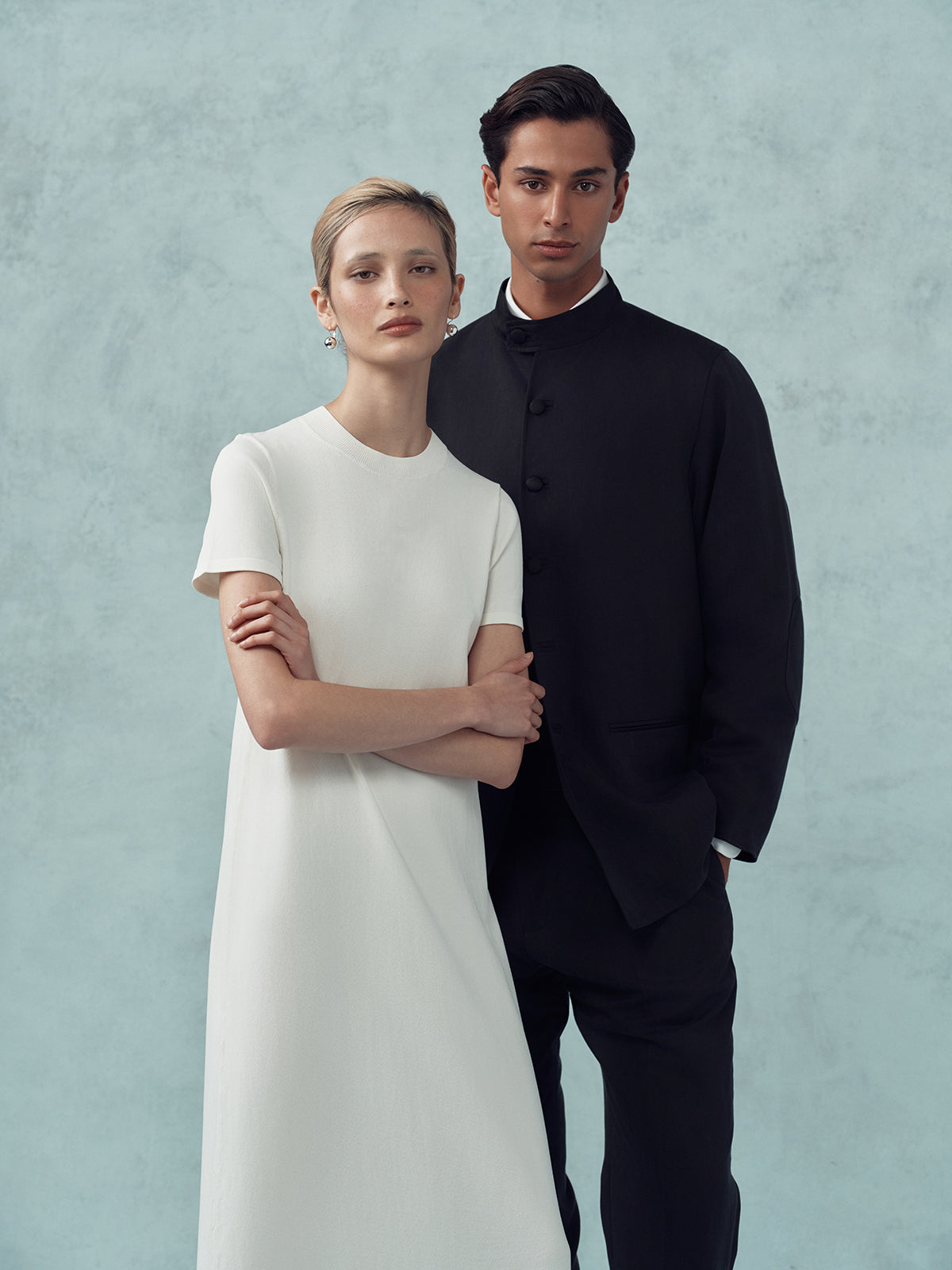 This season’s women’s collection is defined by shades of post-war restraint, details are fine, reductive yet delicate. Take for example the Flo jacket and skirt, with its intriguing crisscross-embroidered fabric or the Tia series with its extraordinarily fine gold jacquard silk window-pane check. You will find culottes, pedal pushers and capri pants (of sorts) in their most tasteful and elegant guises.